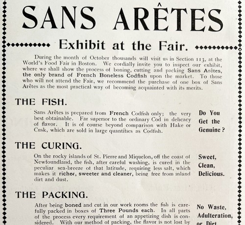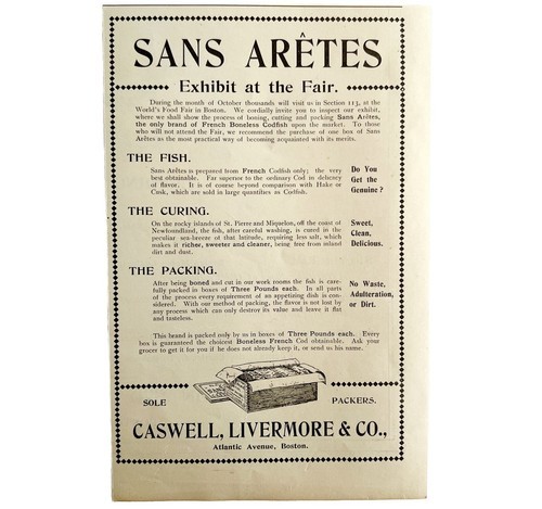 - Sans Aretes Cod Fish 1894 Advertisement Victorian World's Food Fair ADBN1qq
