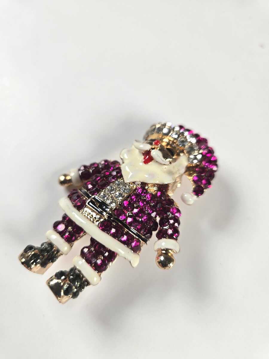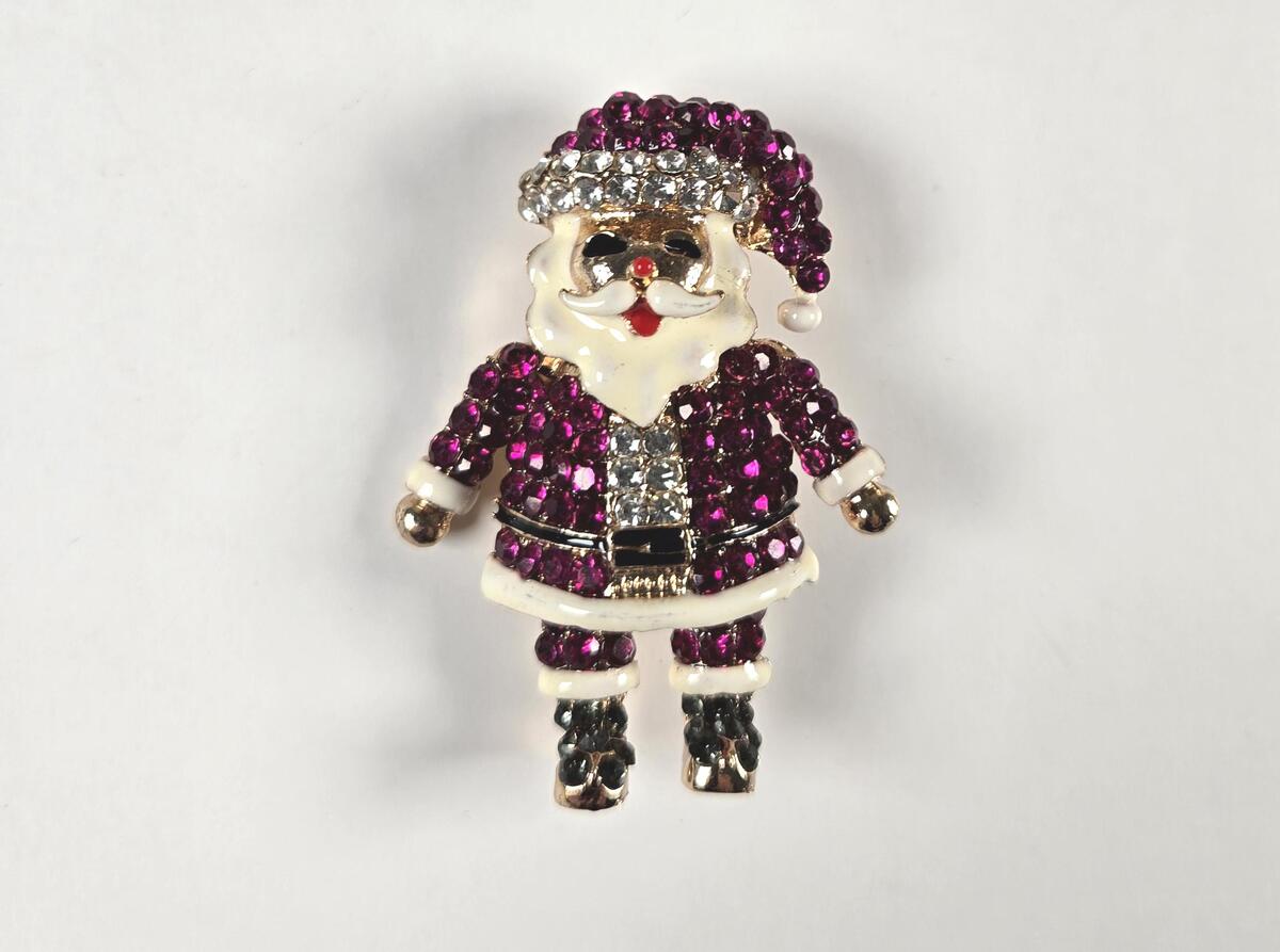 ?Style/Features: Dazzle this holiday season with this magnificent Santa pin. Mulberry (deep berry) rhinestones with white and red enamel in a gold tone frame. Dark gray rhinestones for boots. Would make great ugly sweater jewelry! Ships in a crisp white box ready for a bow or ribbon if it's a gift.