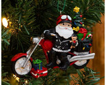 Rev up your engine as you decorate your tree with this Santa Riding Motorcycle Ornament! This novelty ornament features Santa Claus posing on a motorcycle, holding a small teddy bear with the back seat full of gifts. Throughout the piece are shiny metallic details that give this piece a realistic look. Hang this piece with other fun motorcycle ornaments to make your man cave look stylish!