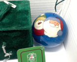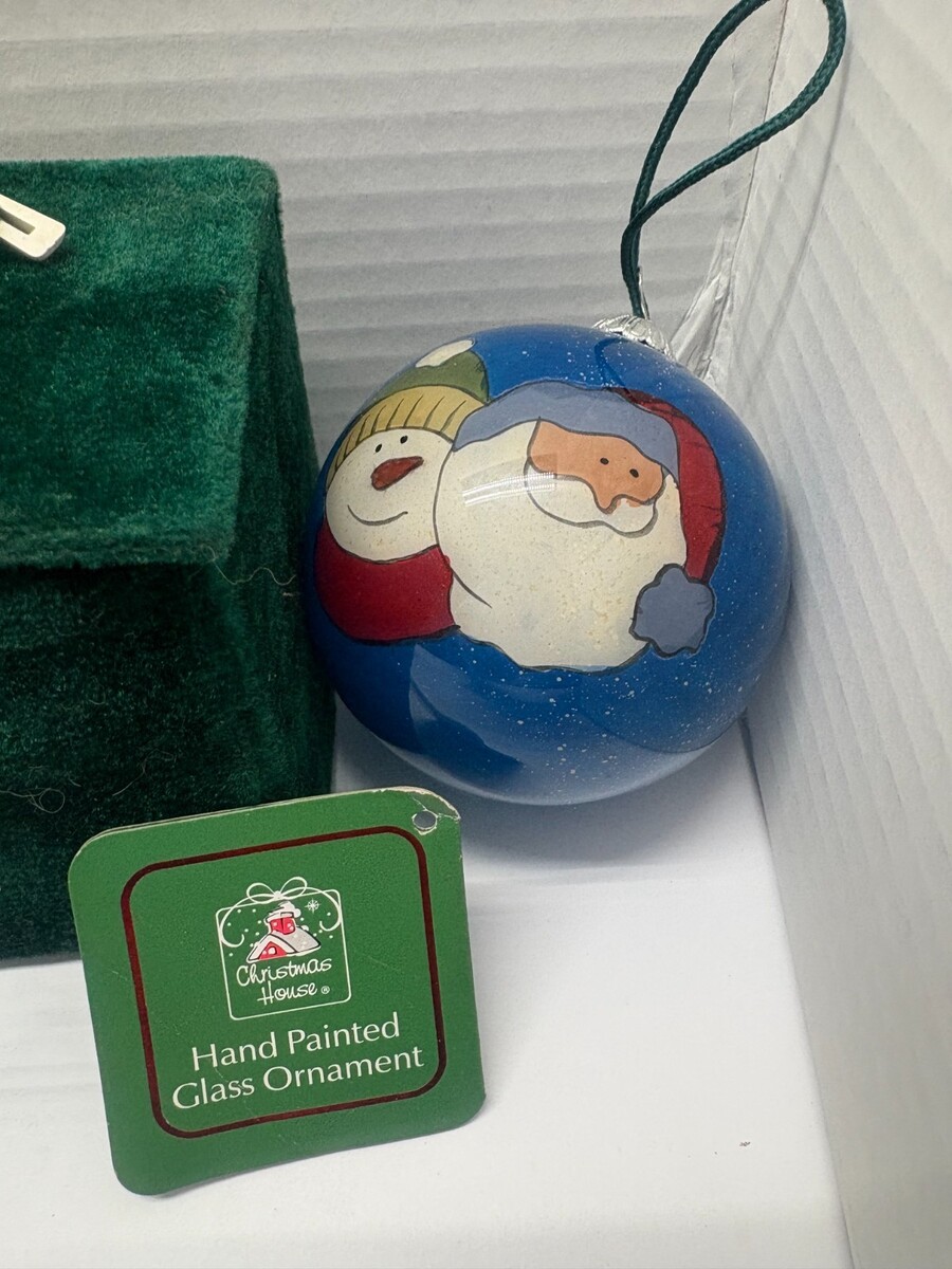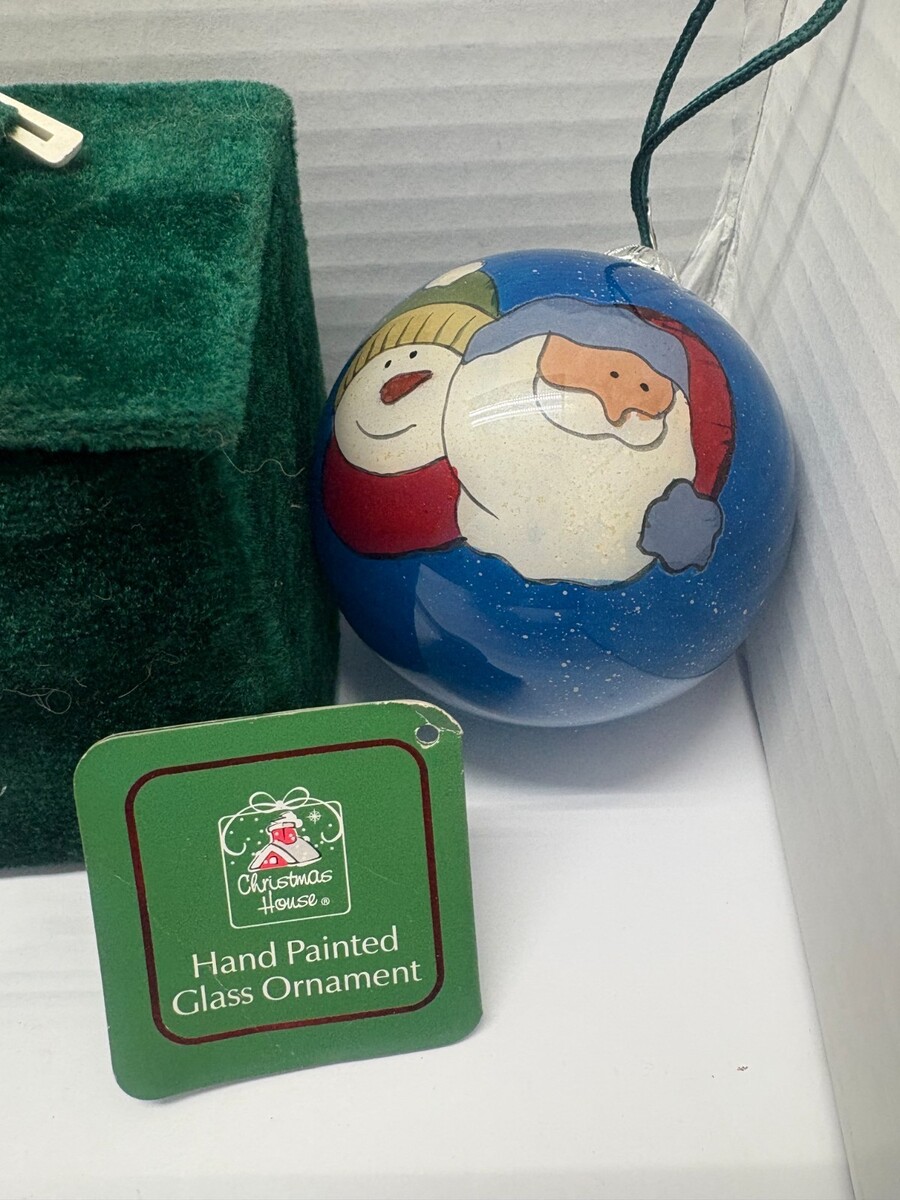 This Santa and Snowman Inside Painted 3" Glass Ball Ornament is a charming addition to any Christmas decor. The multicolor design features a snowman shape with Santa inside, making it a unique and festive ornament. Made of glass and branded by Christmas house, this original piece is perfect for collectors or anyone looking to add a special touch to their holiday traditions. In original velvet box. Has some wear to box.