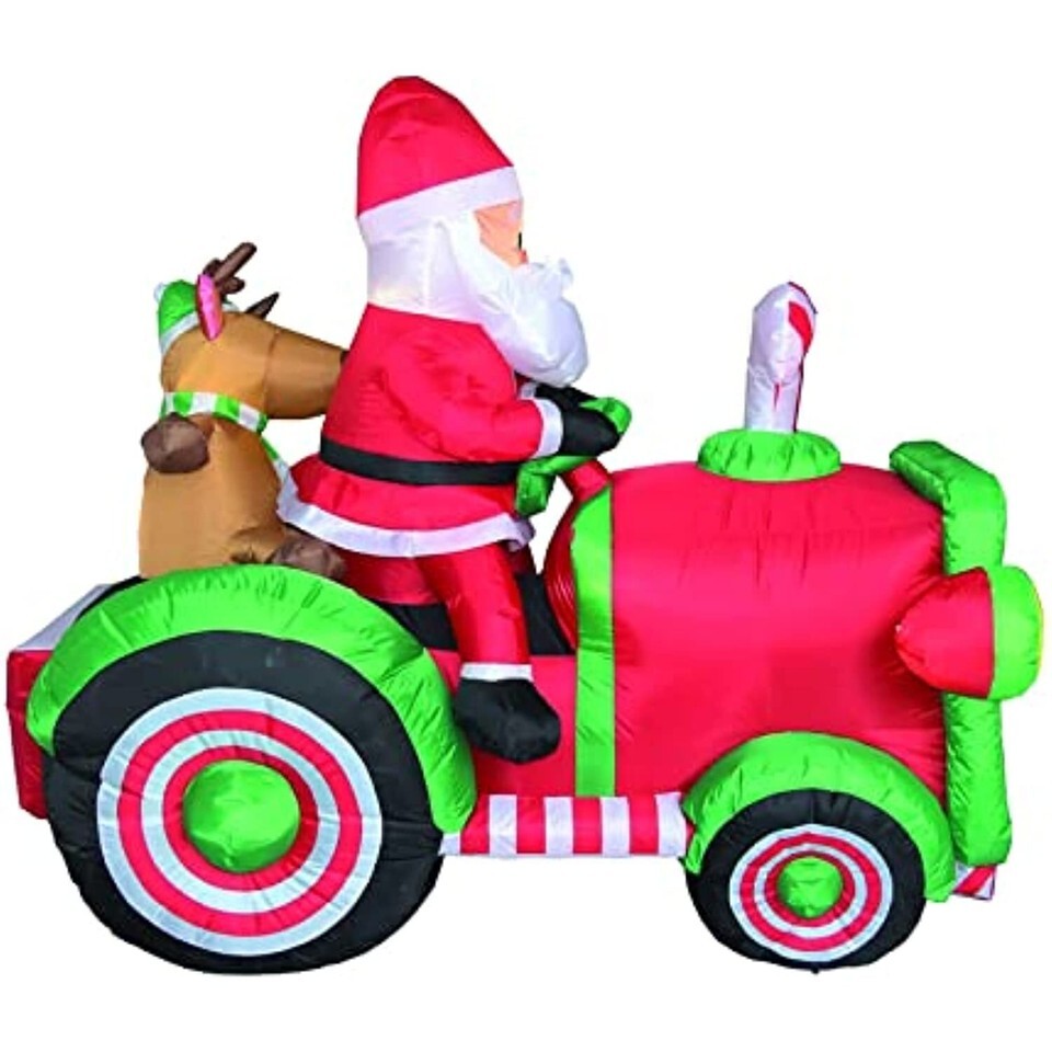 This Inflatable Santa on tractor is a great way to decorate your yard for the Holiday season. Just plug it in, stake it down and watch the magic unfold. Display this large Christmas decoration as a stand alone or combine it with other air blown inflatables to create a custom scene. Includes everything needed for easy outdoor setup.; ; Brand Name: Celebrations Height: 6 ft. Design: Santa With Tractor Product Type: Inflatable Christmas Motif: Santa Light Features: Constant Certifications and Listings: UL Listed Number in Package: 1 pk Length: 9.45 ft. Width: 6 ft.