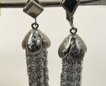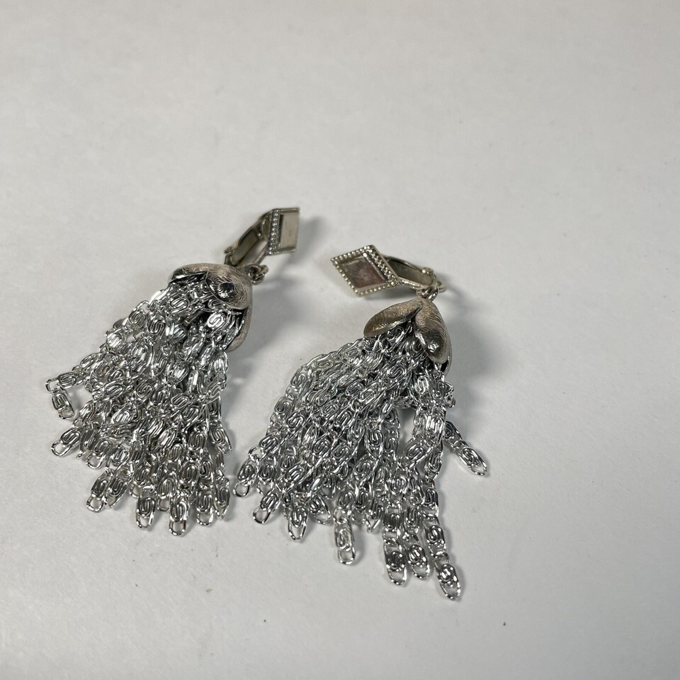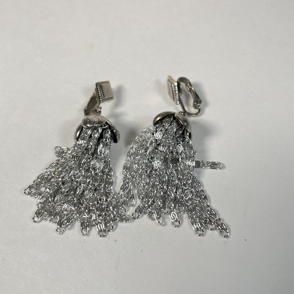 - Sarah Coventry brand vintage 70s silvertone chain tassel clip on earrings
