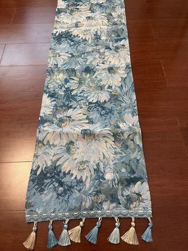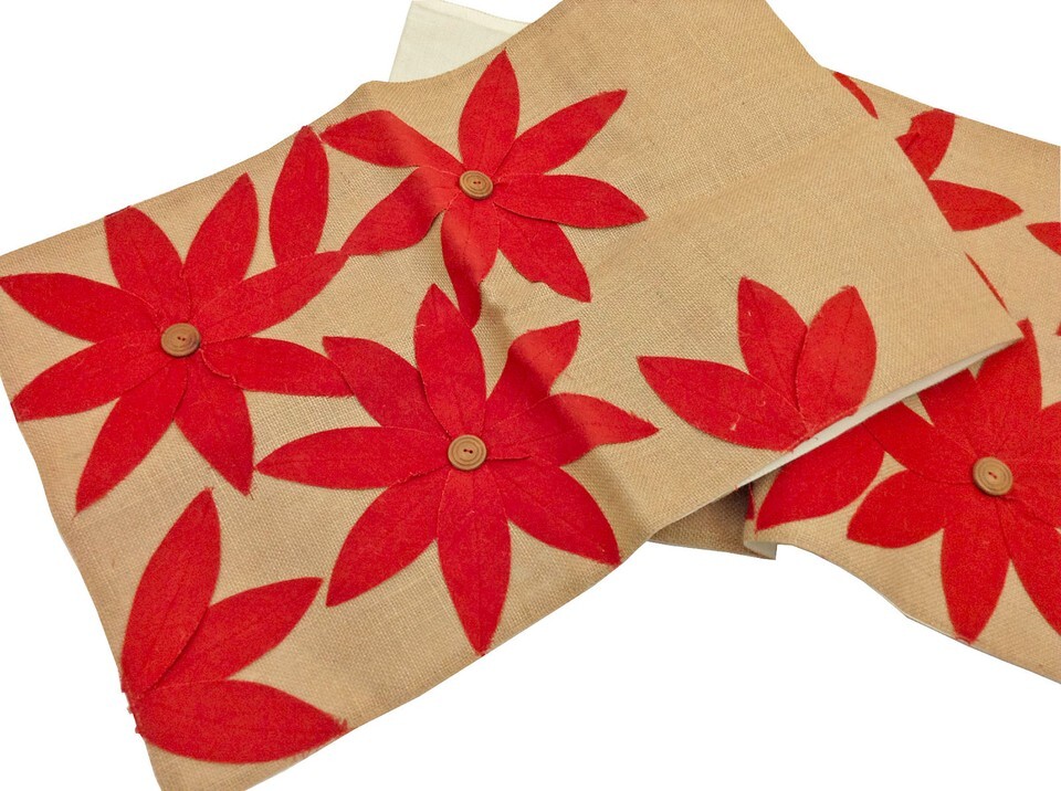 This Airabella Collection table runner features a red floral design with buttons on top of a burlap runner. This runner will add a stylish touch to your seasonal table. 16x72 inches