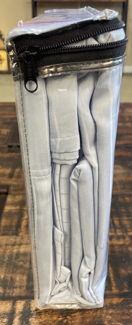 Pre-owned, new in package. The corner of plastic zipped package has come unzipped but sheets are like new in package.