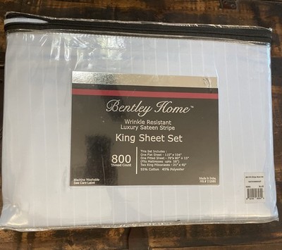 Indulge in luxury with these sky blue striped Sateen King Sheets by Bentley Homes. Made from a blend of polyester and cotton (55% cotton, 45% polyester), these wrinkle-resistant sheets are designed to fit an 18-inch mattress with a deep fitted sheet pocket. The set includes a fitted sheet, flat sheet, and two king pillowcases, all featuring a modern stripe pattern in a sky blue color. Machine washable for easy care, these high-quality sheets are perfect for adding a touch of elegance to your bedroom decor.