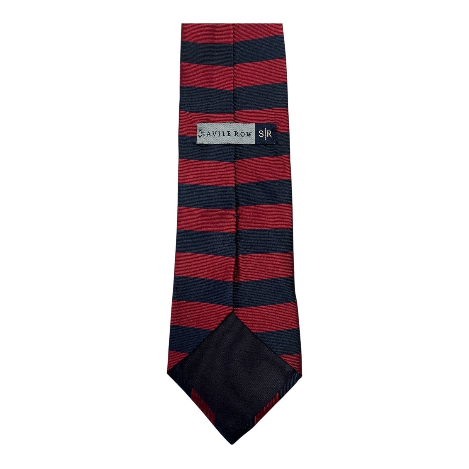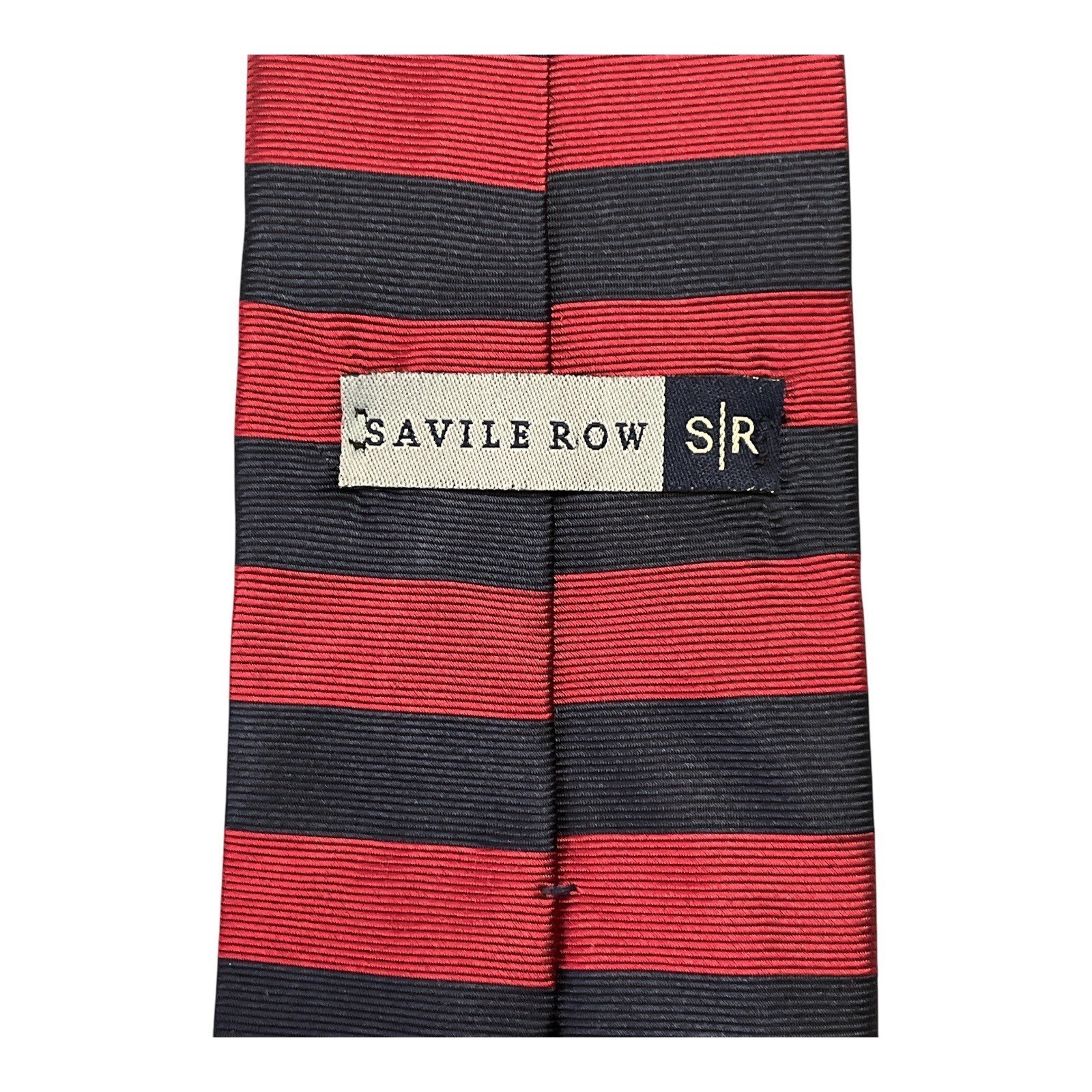 Classic men?s necktie from Savile Row featuring bold red and navy horizontal stripes. Crafted from 100% imported silk, this timeless piece offers a rich texture and sheen that complements both formal and business attire.