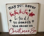 Features an inspirational message: "May you never be too old to search the skies on Christmas Eve" with festive red and black lettering.