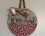 Features a festive design with red peppermint swirls and a warm "Welcome" message.