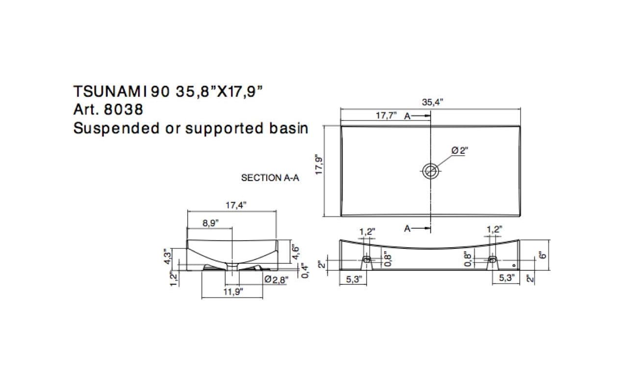 - Scarabeo 8038 Tsunami 90 Rectangular Ceramic Wall Mounted Vessel Sink White