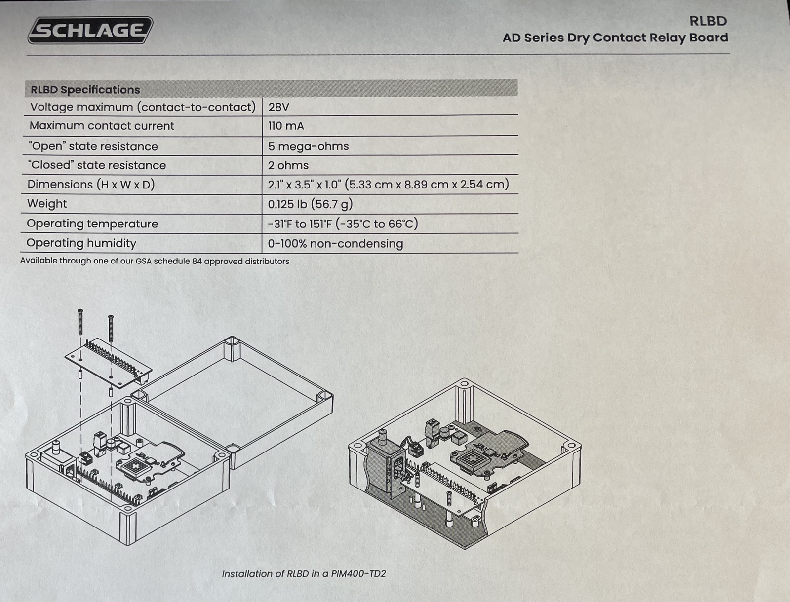 - SCHLAGE RLBD RELAY BOARD KIT FOR PIM400-TD2 OR PIB300-2D DOOR ACCESS SYSTEM