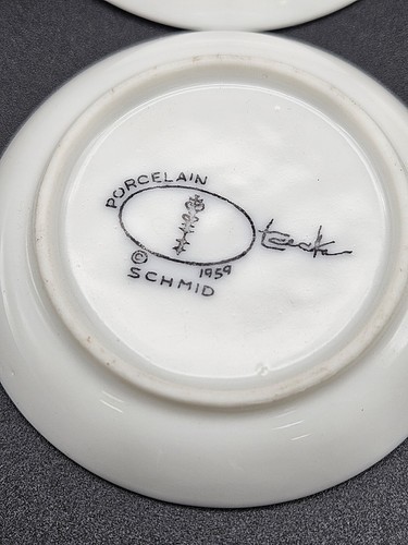 This is a set of 8 vintage porcelain espresso cups and saucers designed by Lagardo Tackett for Schmid in 1959.
