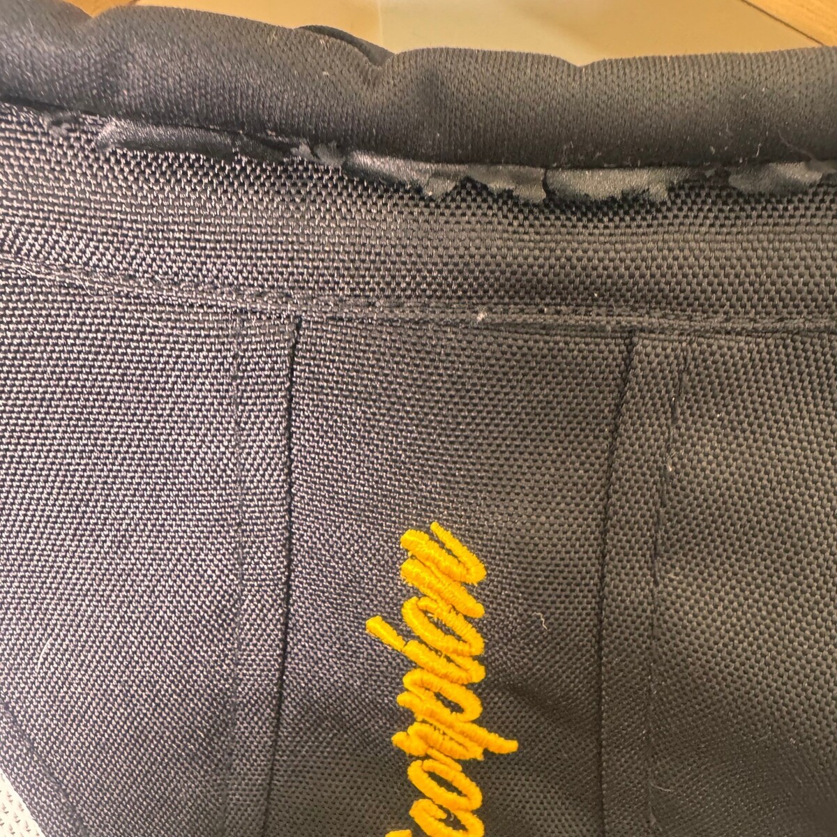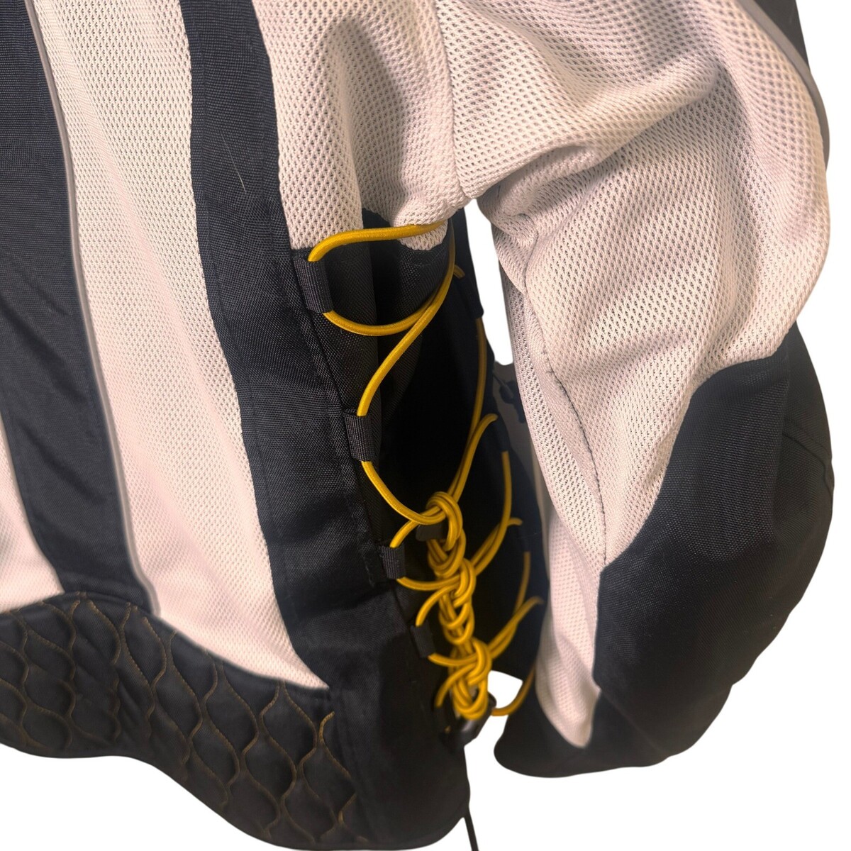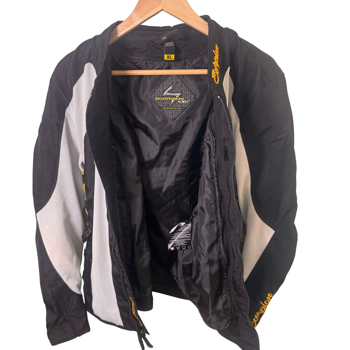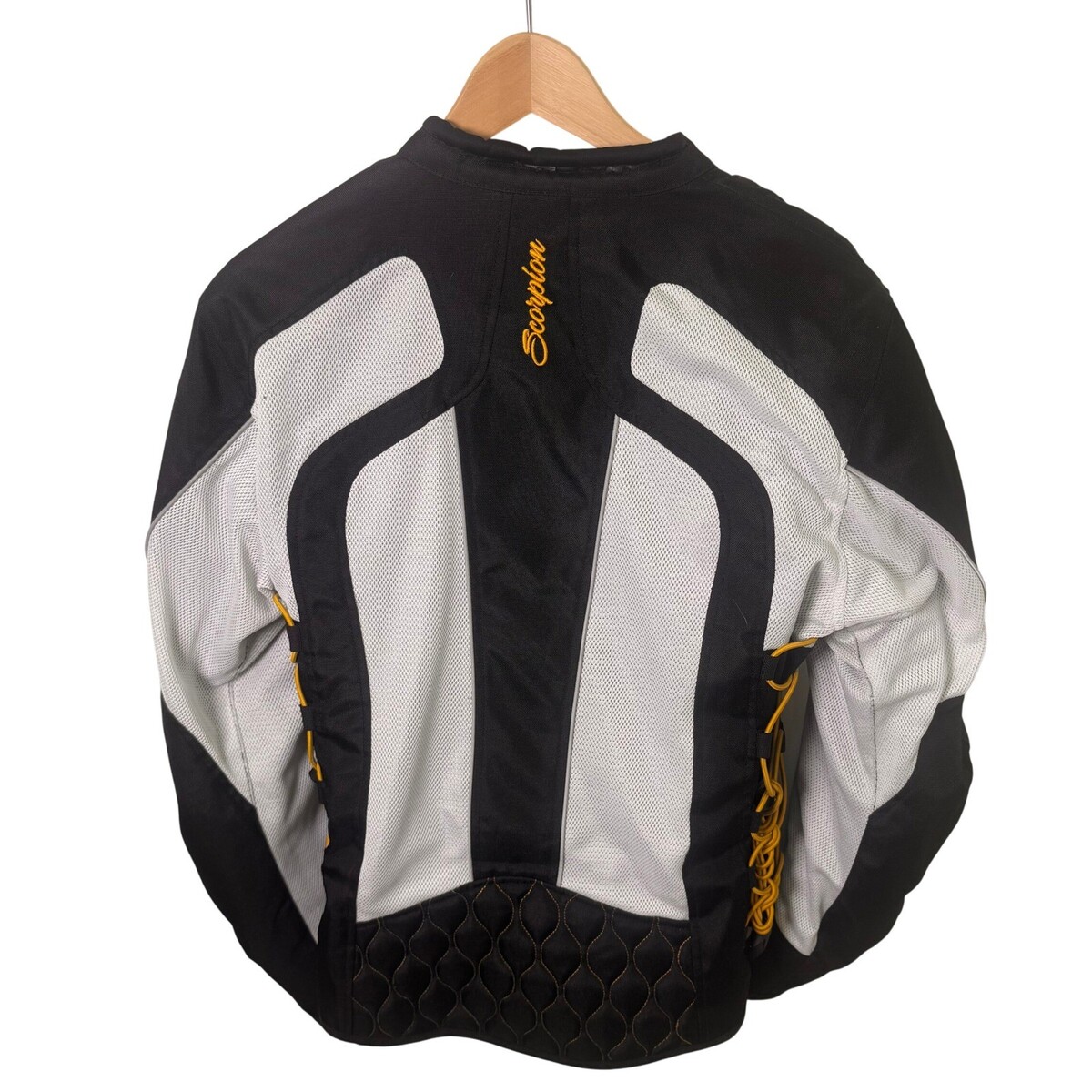 Embrace the open road with this sporty Scorpion EXO motorcycle jacket. This jacket is a stylish armor of confidence, designed with strategically placed mesh panels, creating a symphony of ventilation that keeps you cool and refreshed during long rides. The sleek black and silver color palette exudes a modern sophistication, while yellow lace-up detailing adds a touch of edginess. Soft padding offers an additional layer of comfort and safety. Perfect for weekend road trips, urban commuting, or any adventurous outing where protection and style go hand in hand. Pit 2 pit 18.5in, sleeve 24 in, Length 24 in.