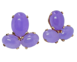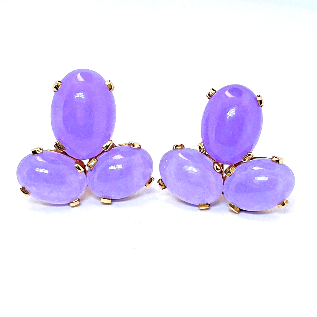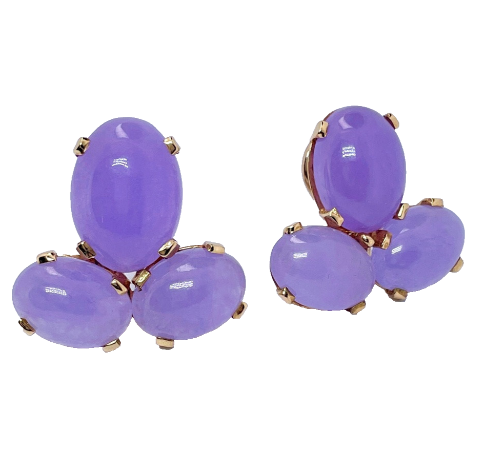 The earrings vary slightly as there is a 2mm difference in the darker lavender jade cabochon in each earring. With one earring measuring 1 1/16" tall and 1 1/16" wide and the other measuring 1" tall by 1 1/16" wide (27mm x 27mm, 25mm x27mm).