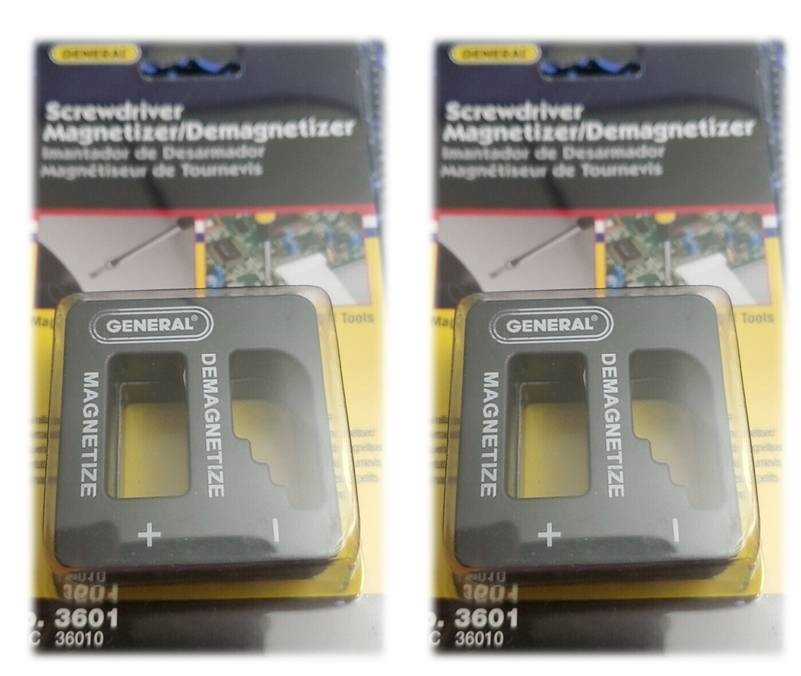 The General 3601 Precision Magnetizer and Demagnetizer is a compact, dual-function tool designed to magnetize (gauss) or demagnetize (degauss) screwdrivers, nut drivers, wrenches, taps, and other small hand tools. Measuring 2 inches in length with a 2 x 2 x 1-1/8 inch footprint, it features a durable black-and-gray housing and built-in magnetic circuits that deliver reliable performance for precision tasks. Simply insert a tool into the designated side to magnetize for better fastener control, or through the opposite side to demagnetize and prevent metal shavings or interference with sensitive electronics. Its 40 lb nominal load capacity ensures robust construction, while the carded packaging makes it easy to store or display in workshops and toolboxes.