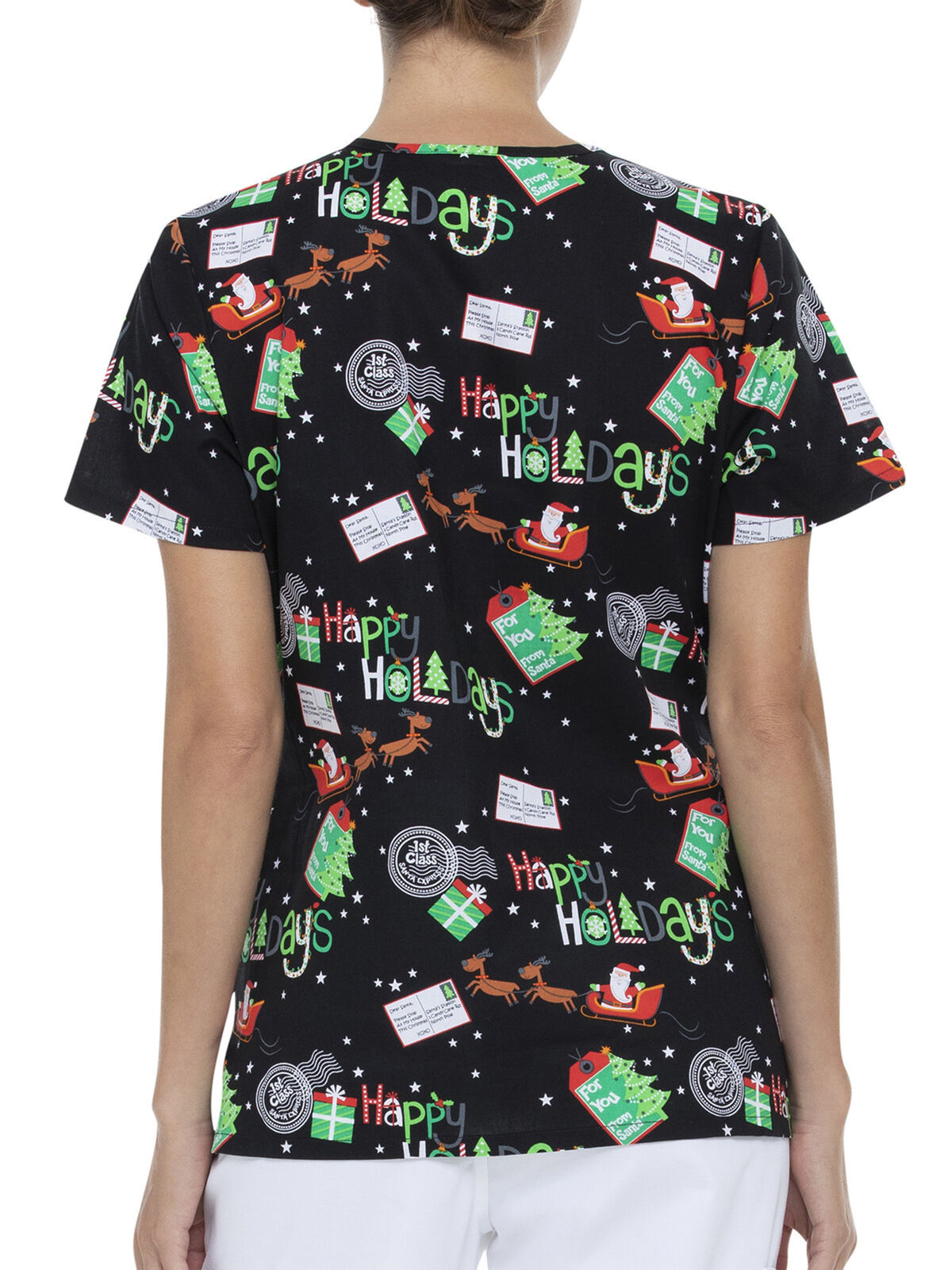 Priority mail alert! This very merry top puts a modern spin on your holiday scrubs style, with a storytelling print that captures Santa's one-night ride. Featuring a mock-wrap design, roomy front pockets and made-to-move fabric, it'll deliver a visual treat for patients and pros alike.