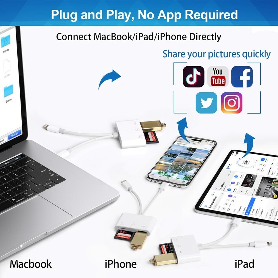 3-IN-1 CARD READER FOR iPHONE iPAD: Features dual slots for SD and MicroSD (TF) cards plus a USB-A port, allowing connection to USB flash drives, cameras, keyboards, MIDI devices, headphones, and more. (Not compatible with printers)