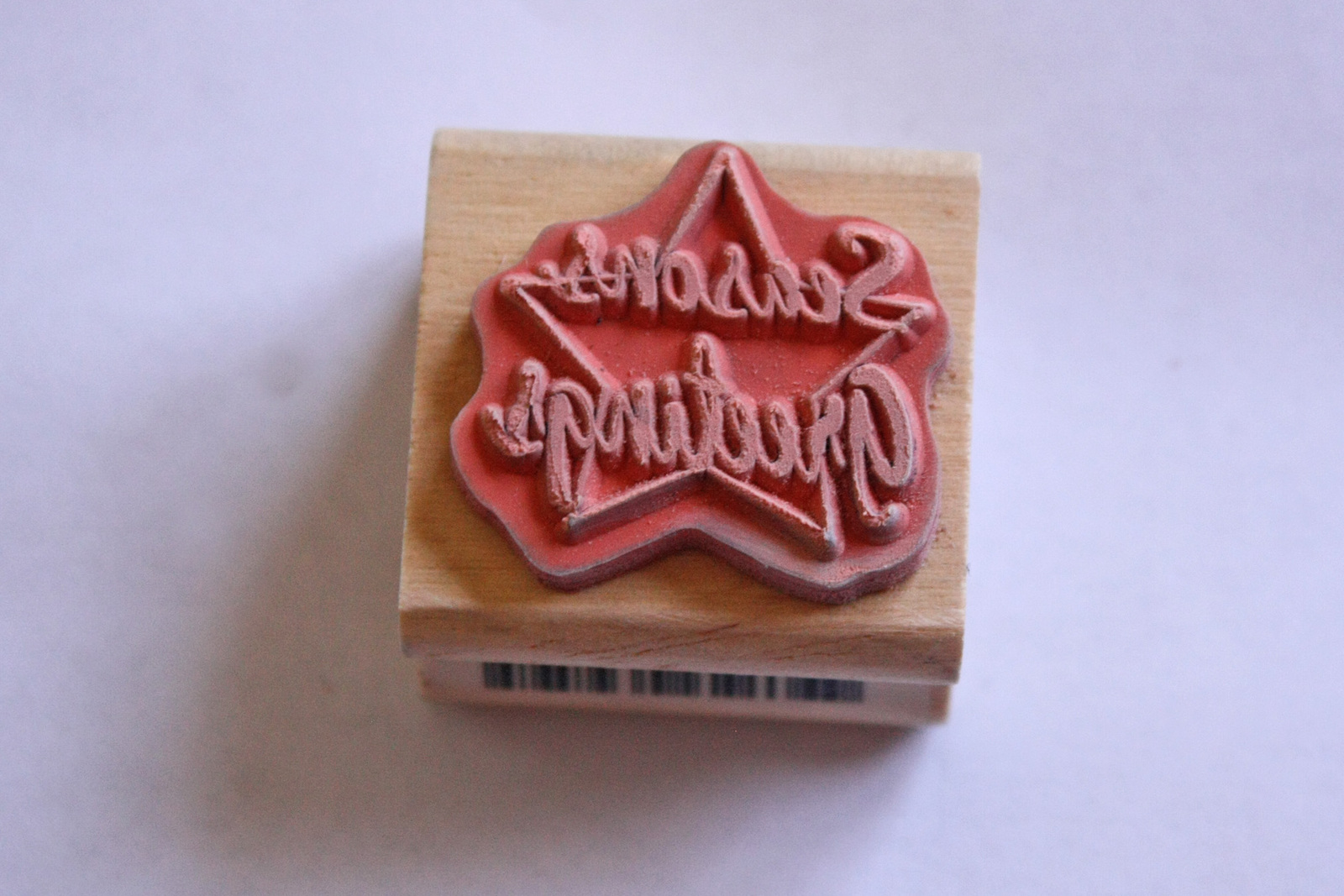 This is a small mounted rubber stamp that is in excellent condition. The stamp has a star and "Seasons Greetings" across it. There is very little ink residue on the rubber and no ink staining on the wood. The stamp is 1.25" x 1.25" with 1" x 1" stamp area. Great Christmas stamp.