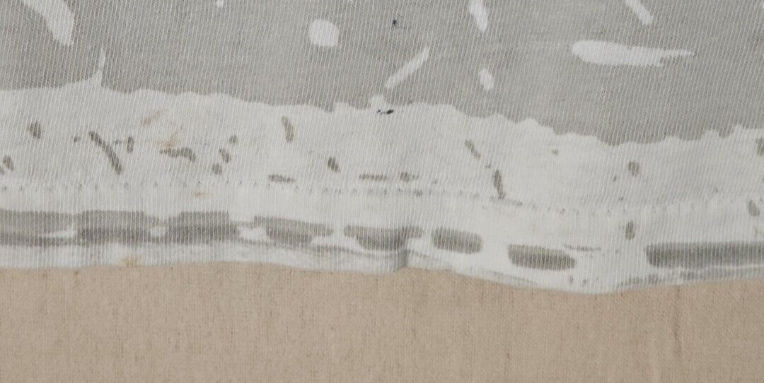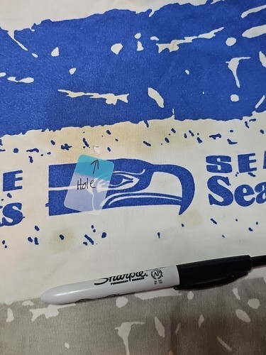 There are 2 light stains on the left lower back side of the shirt-- one with a very small hole--I have done my best to take several photos of this.