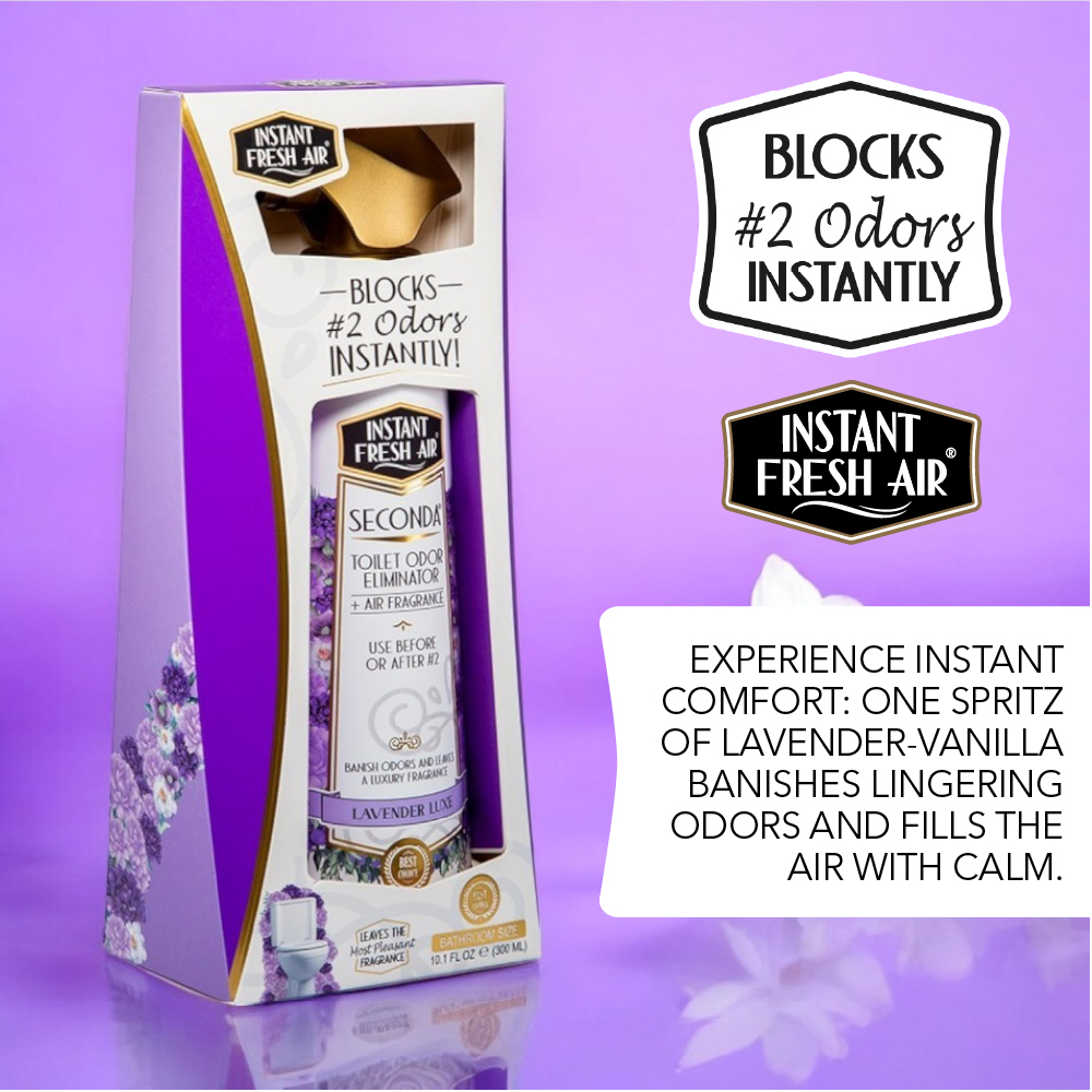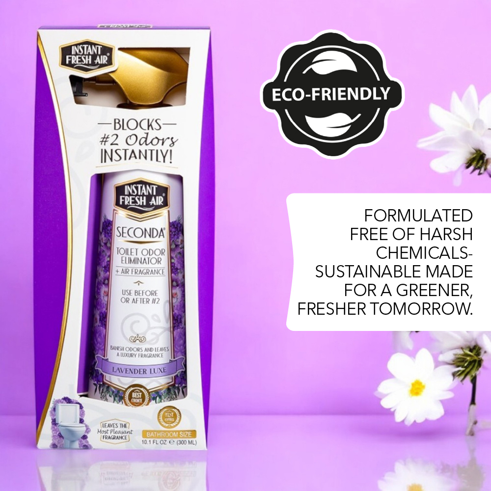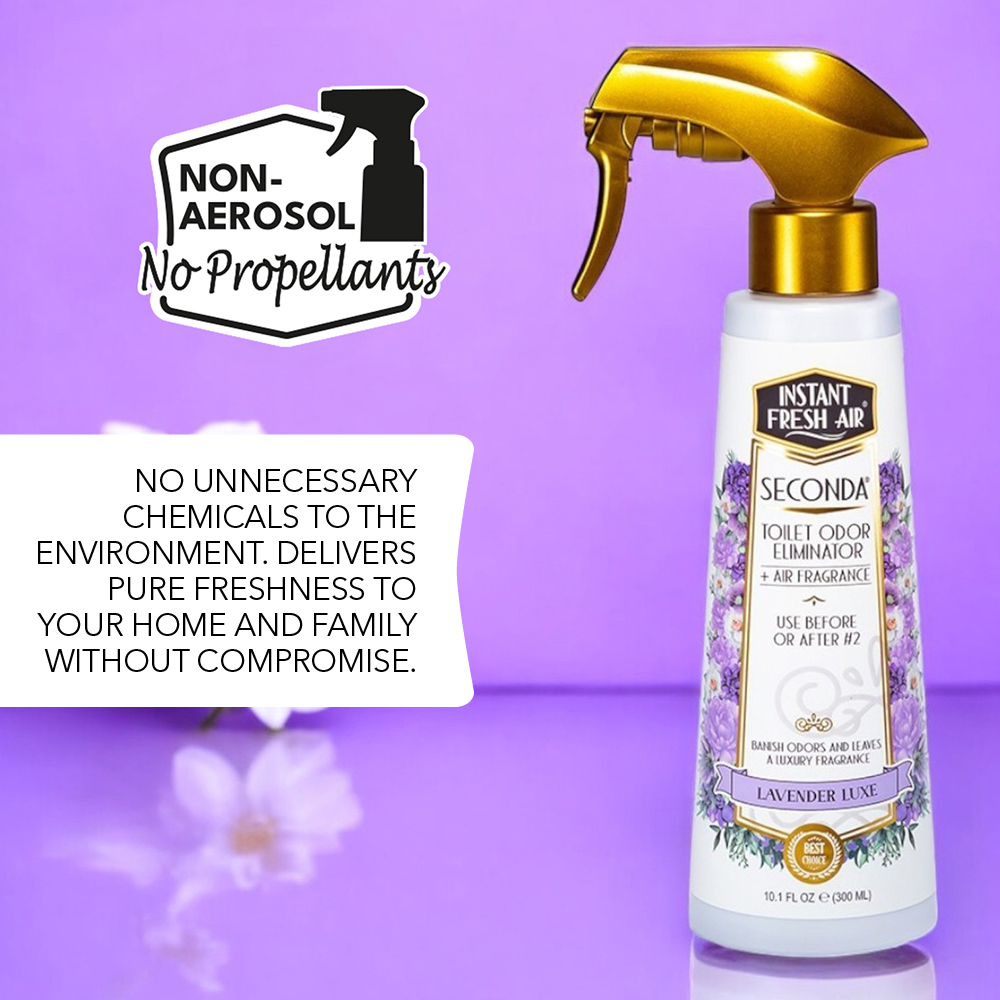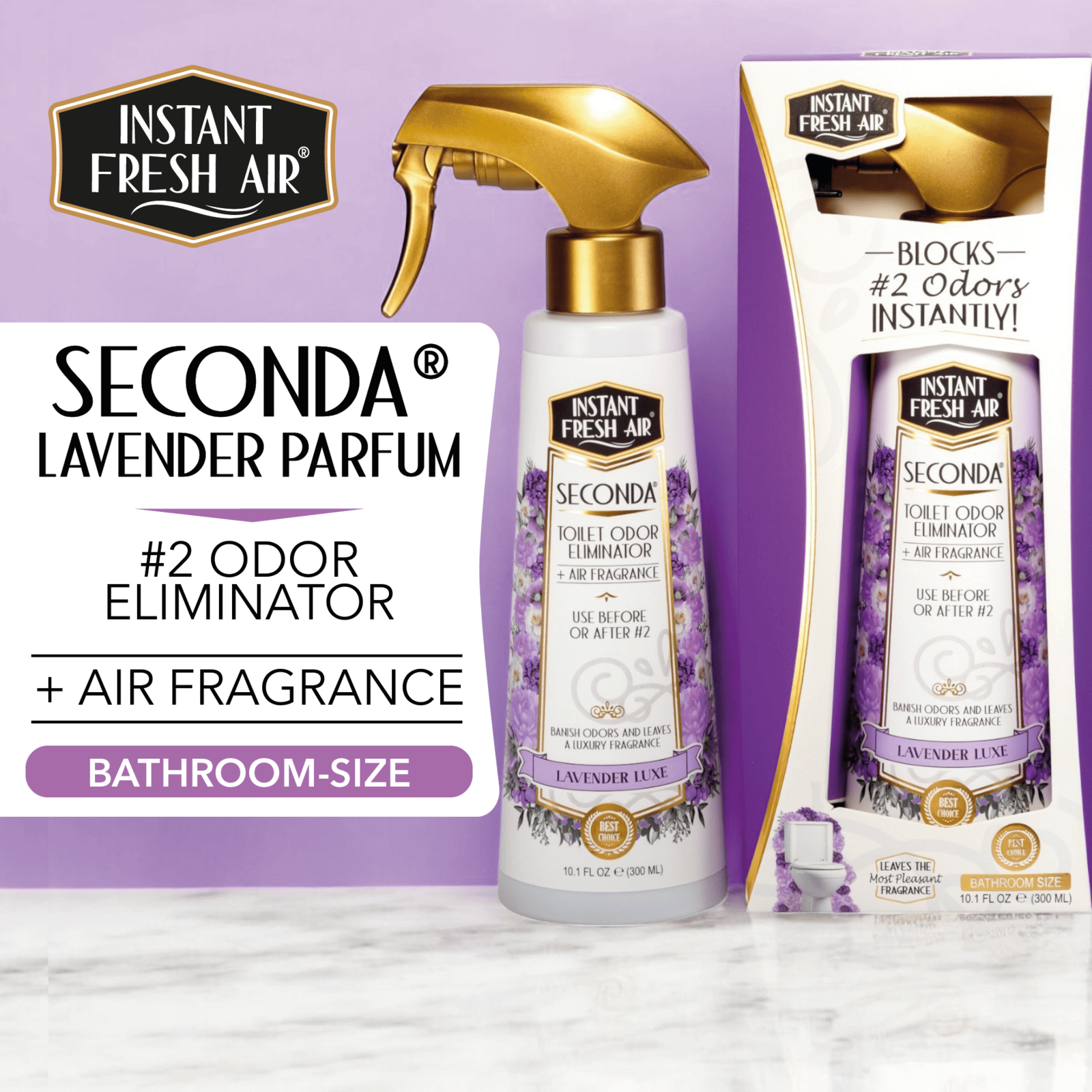 Create a serene bathroom atmosphere with Seconda Lavender Luxe, the toilet deodorizer and odor eliminator specifically designed for use before or after going #2. Infused with the soothing essence of premium lavender, it neutralizes unwanted odors—including those from poop or poo—at the source. Whether used before or after those essential moments, a few sprays into the toilet bowl or the air keep your bathroom feeling calm, clean, and beautifully refreshed.