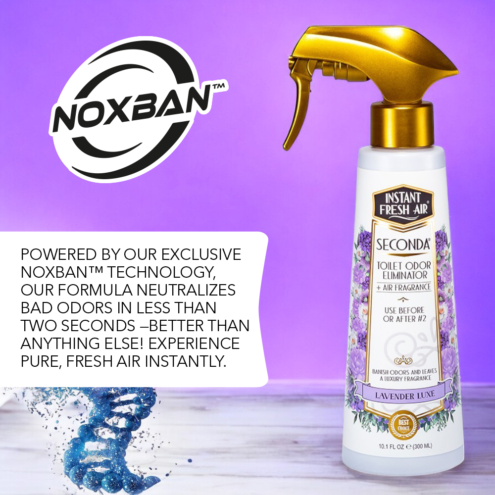 With its larger, in-bathroom bottle, Seconda Lavender Luxe offers a cost-effective, long-lasting solution to everyday odor control. Unlike typical air fresheners that simply mask smells with perfume, Seconda uses NoxBan to eliminate odor molecules instantly. Biodegradable and safe for the environment, it leaves a pleasant, elegant fragrance that enhances any bathroom with a touch of peaceful luxury.