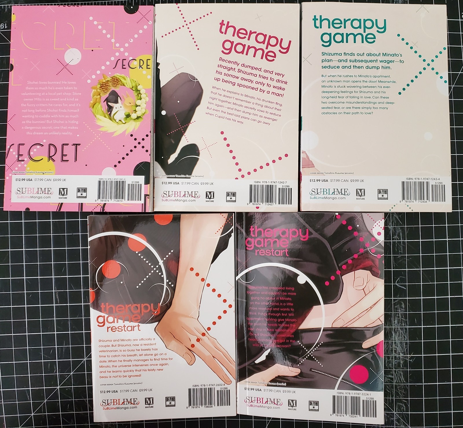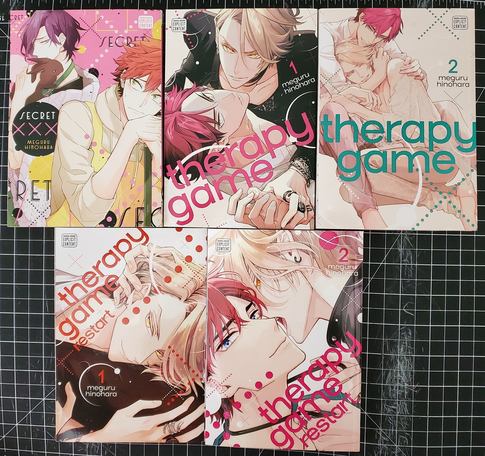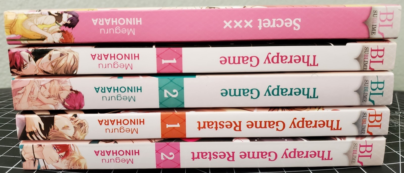 These were bought new and read a few times. There is cover and edge wear from reading. There is also spine damage on Secret XXX, Therapy Game 1 and Therapy Game Restart 2