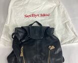 See By Chloe Black Leather Backpack With Dust Bag. In used but good condition. There are some stains on the bag from normal use. The exterior base has some scratches on the bag. The zippers work smoothly. The bag measures 16x14?