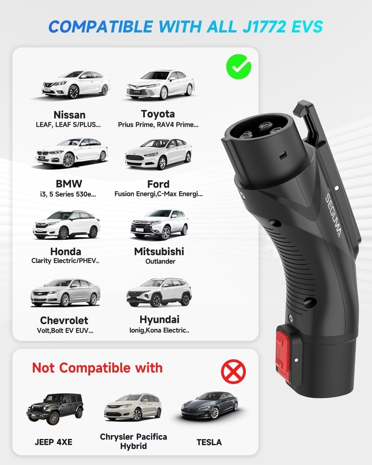 - Seguma EV Charging Adapter for Tesla to J1772, Up to 60Amp with Safety Lock, IP6