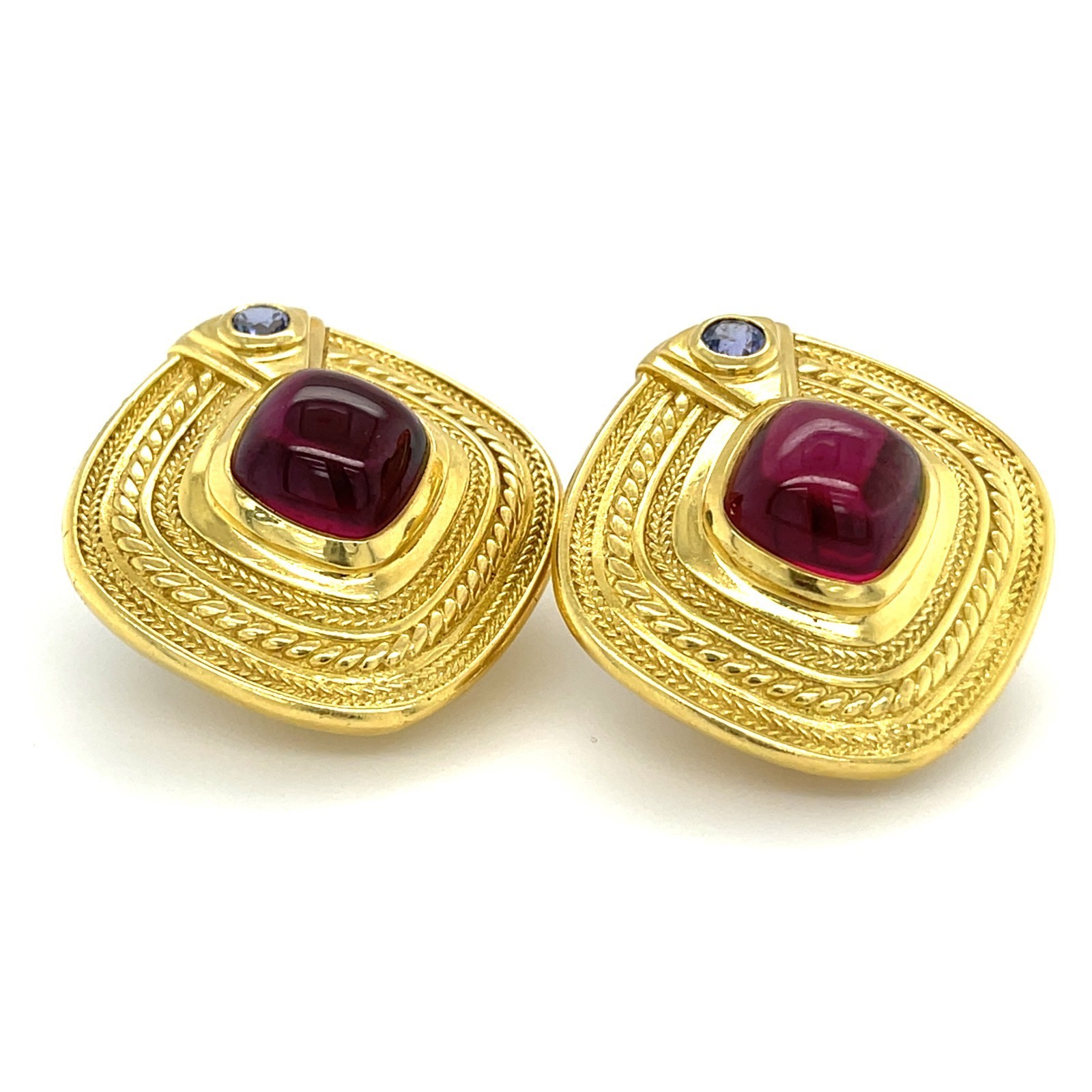 - SeidanGang 18k Yellow Gold Garnet and Tanzanite Cabochon Earrings