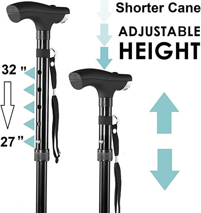 Shorter Cane - Adjustable from 27-32 inches tall. Why is this so special? This cane has it all. Foldable so you can store it easily. Adjustable for different heights. 4 rubber feet under the swivel leg to allow the cane to stand on its own when you need to set it aside. A bright light so you can see going downstairs or at night. A wrist strap so you don't lose it when walking.