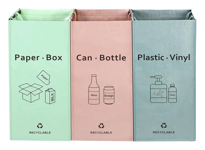 Separate Recycling Bin for Kitchen Home - Indoor Recycle Bins (Pink, Green, Gray) Waste Trash Sorting Bins, Reusable Waterproof Affordable Recycle Bags, Pack of 3 Bags