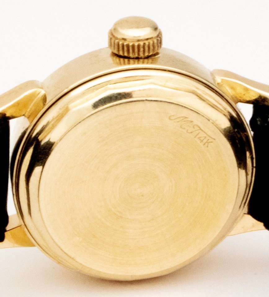 Watch description: Round gold dial, 14K gold case, gold indices, Numerals 12 and 6, gold hands, round bezel, gold back, inscribed on face: Mathery Tissot and Swiss. Inscribed on back MT 14K