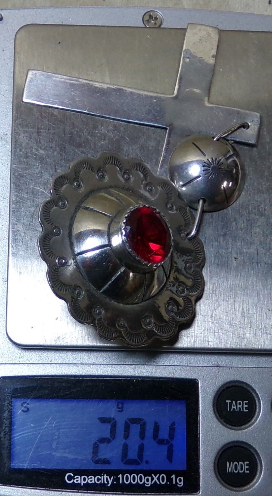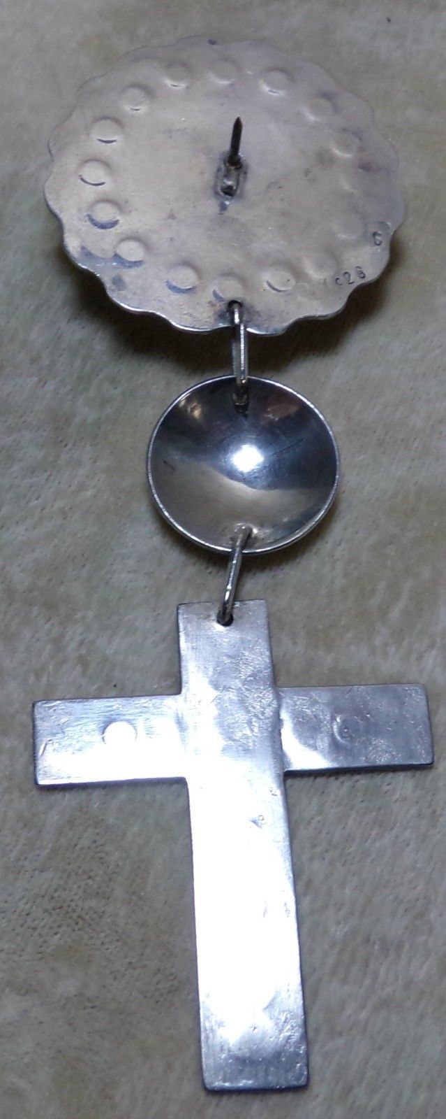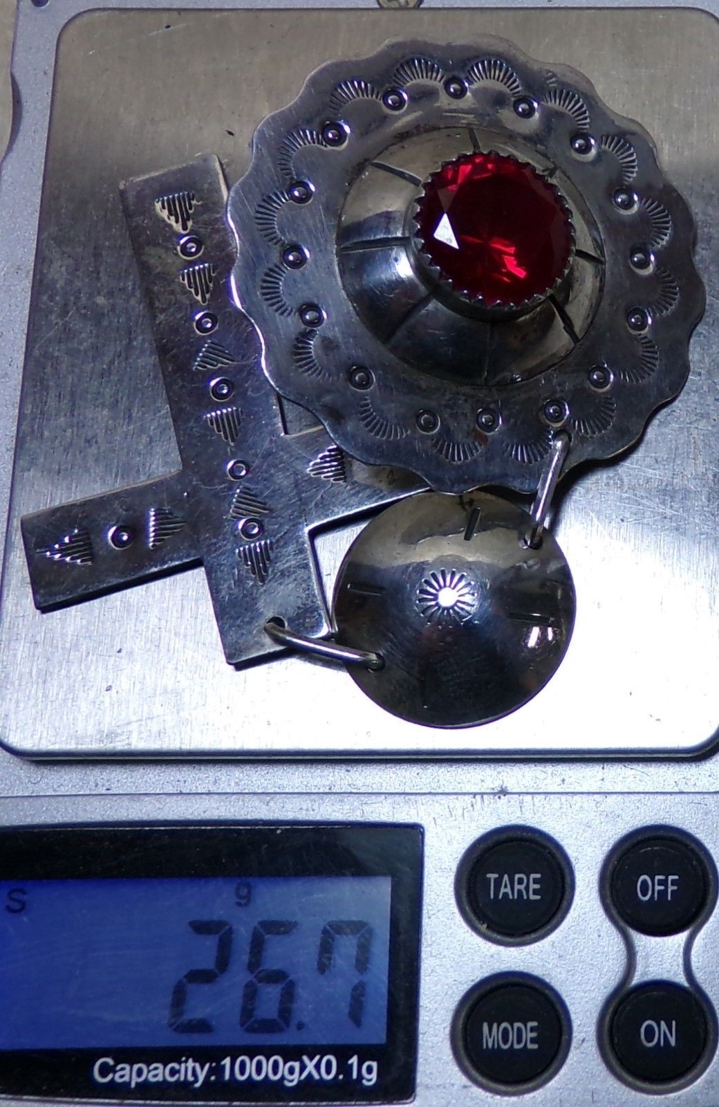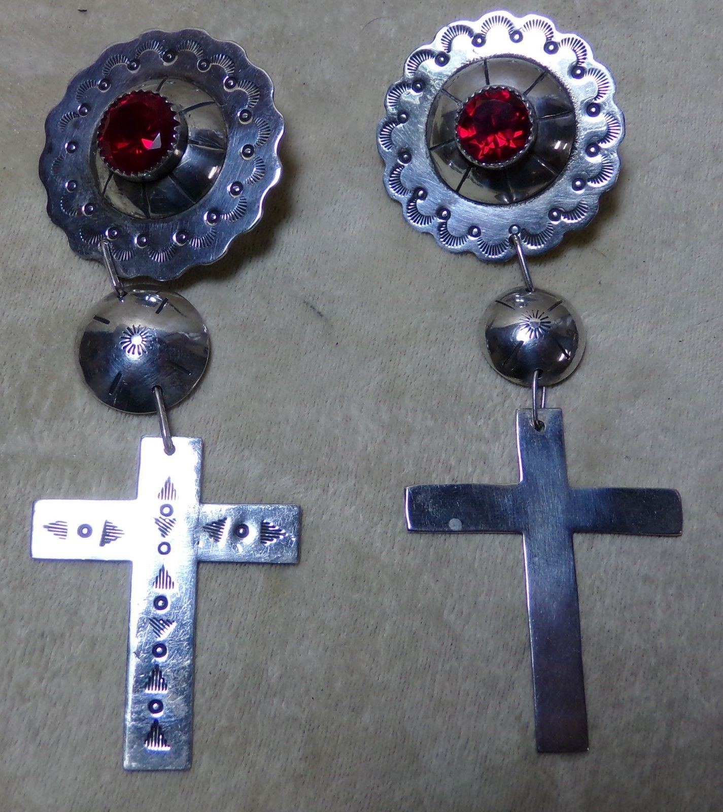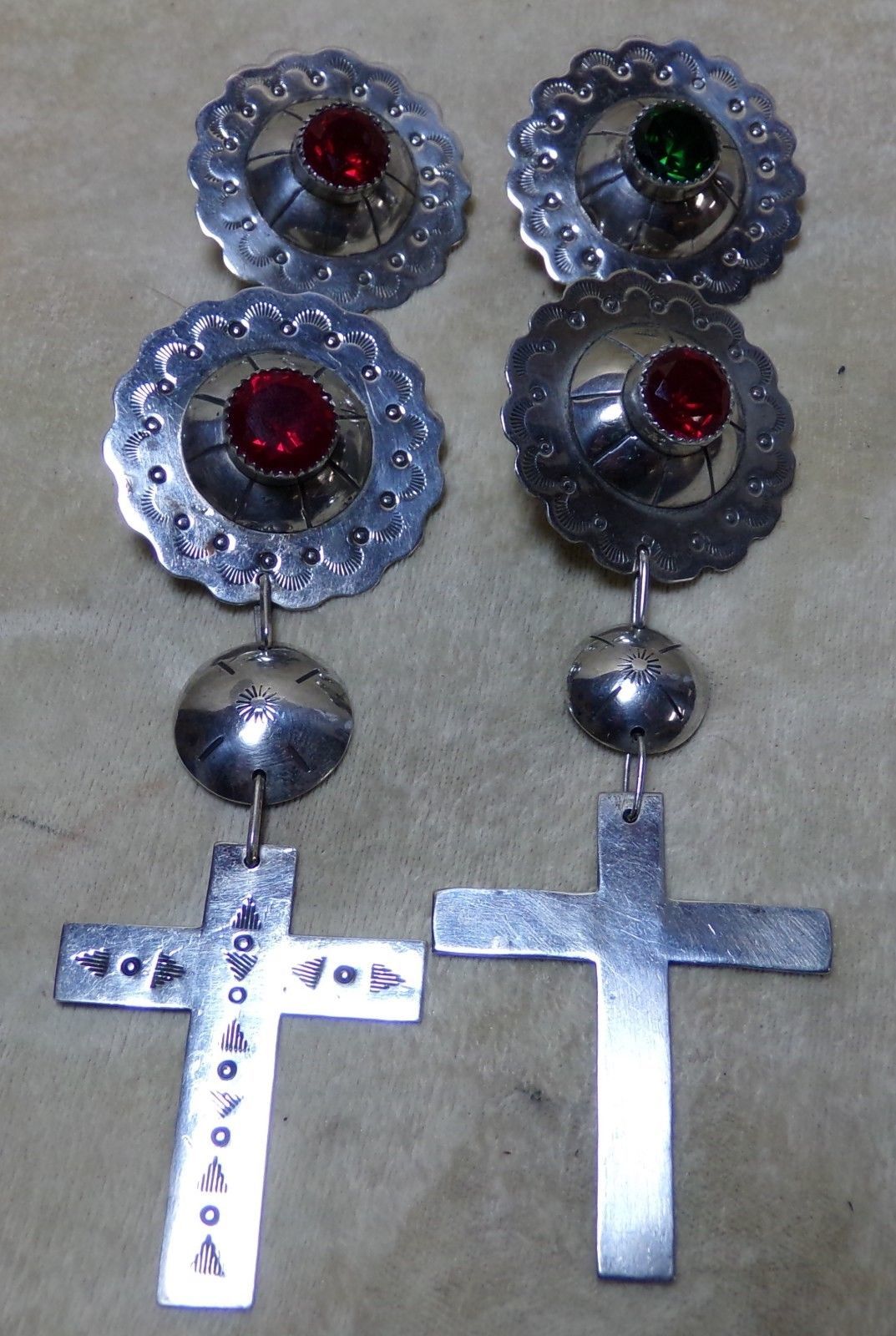 For your pleasure from Wewoka St Pawn of Oklahoma we have a gorgeous vintage Set of 4 Sterling Silver Concho Cross Pin or Brooches by S L. They measure 4 5/8" tall by 1 5/8" wide and the straight pin in back is 3/8" thick. This is a beautiful set the Crosses are different 1 is Smooth the other has stamping. The conneting Conchos 1 is a little larger than the other. They are marked 925 have been tested and are Sterling Silver and the set weighs 69.1 grams. They are marked with S Bear Paw L.