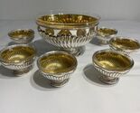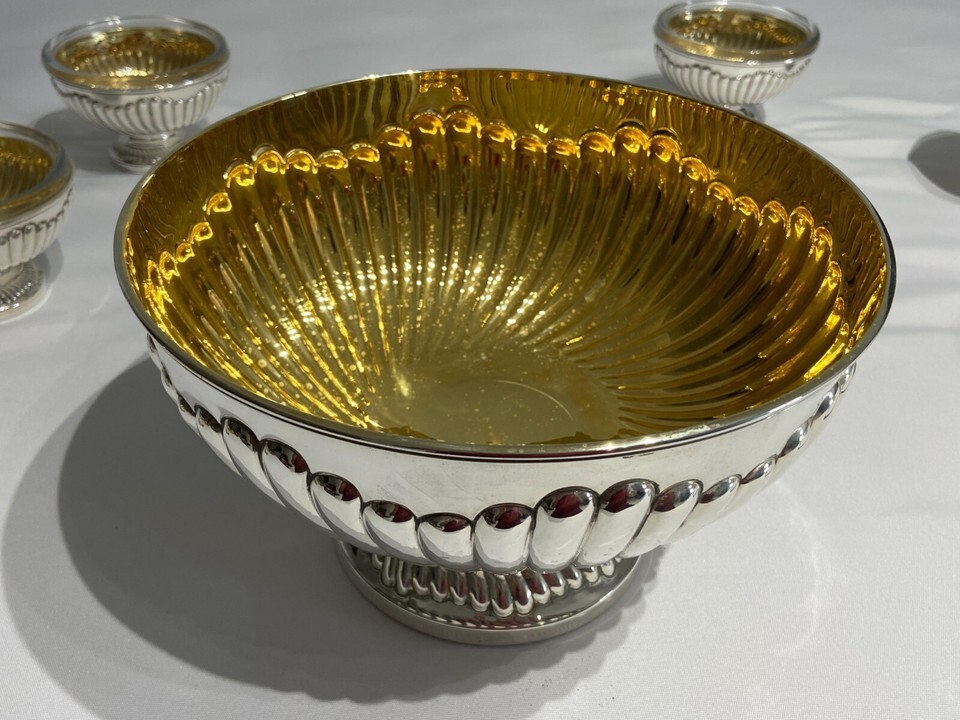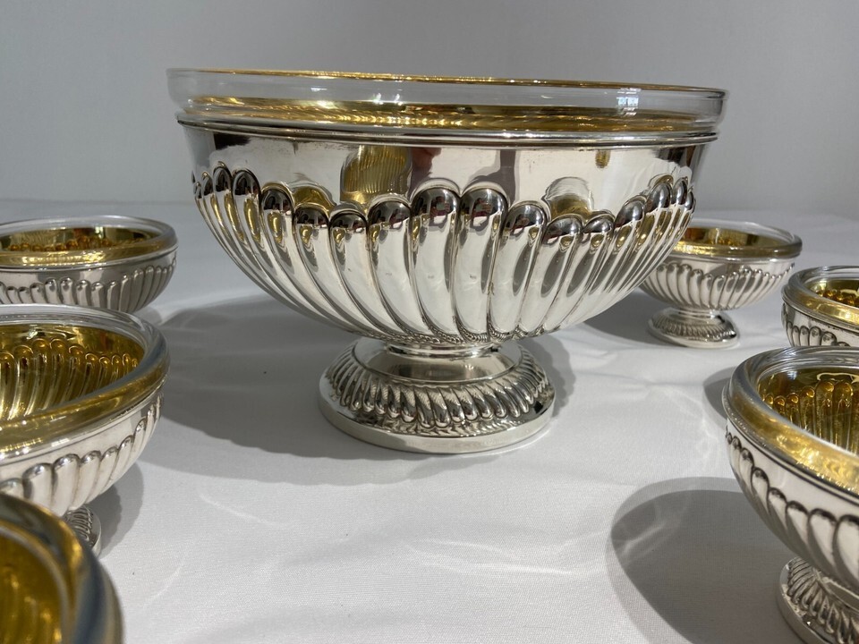 Le sei coppe piccole pesano al netto delle ciotole in vetro grammi 645,00 di argento 800.
