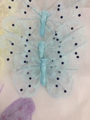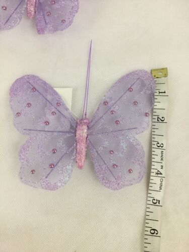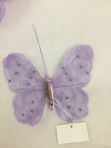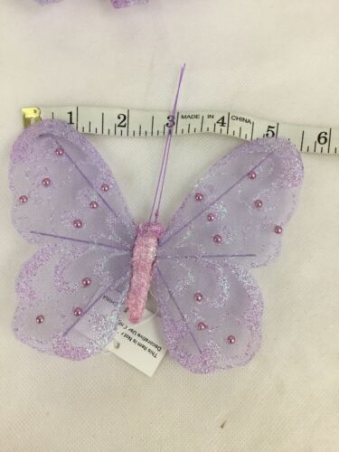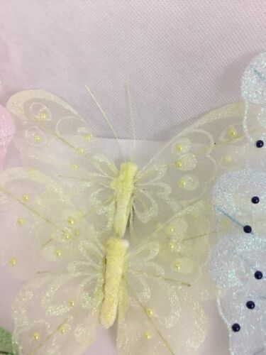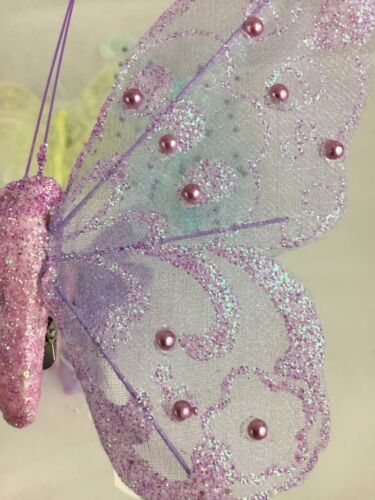 Set of 13 pastel glitter butterflies clip on with applied beads. Each butterfly is clip on, yellow, pink, green,purple and blue. Item is a QVC item new in box. Butterfly is 5 inches across measuring by top of wing span and height is 4? from the top of wing to bottom.