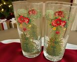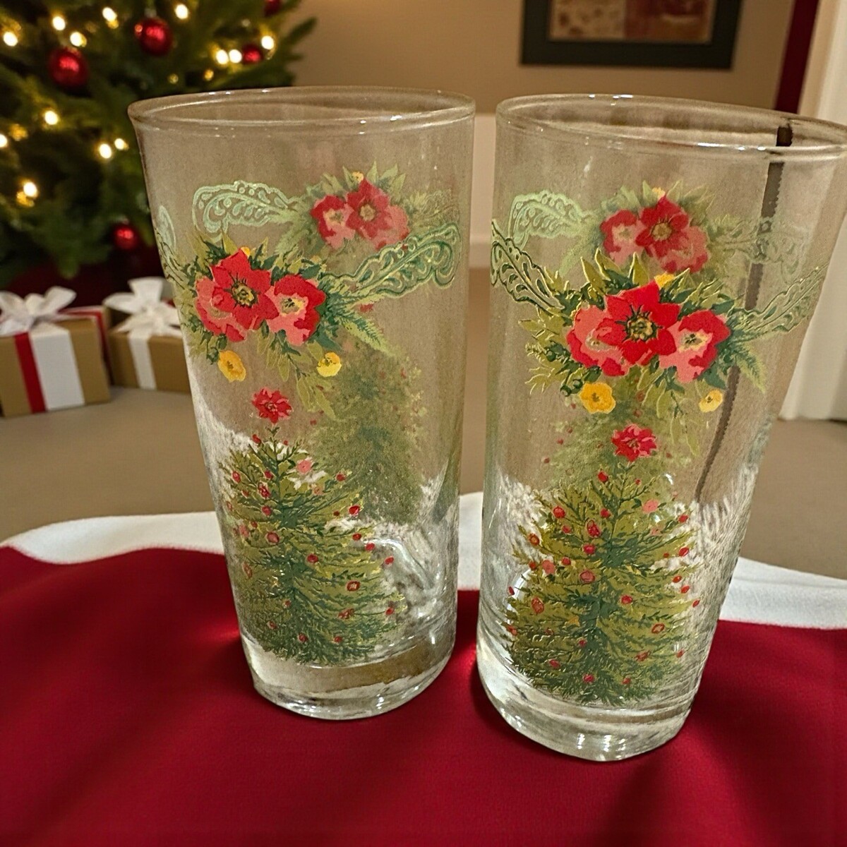 - Set of 2 HOLIDAY 6" Vintage TUMBLER GLASSES CHRISTMAS TREES floral red green