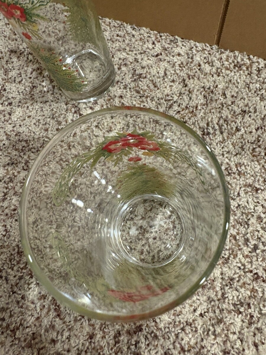 This set of 2 holiday-themed 6" vintage tumbler glasses features a festive design with Christmas trees and floral accents in red and green. Made of glass, these multicolored tumblers are perfect for serving holiday drinks in style. Ideal for Christmas gatherings or as collectibles for any holiday enthusiast, these glasses add a touch of vintage charm to your holiday decor. Cheers to the holiday season with these adorable and versatile tumbler glasses. Please let me know if you have any questions!