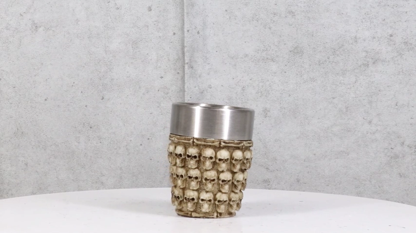 ? This Ossuary Skull is made of polyresin with stainless steel inner cup liner. The sculptural housing is hand painted and polished in bone color.