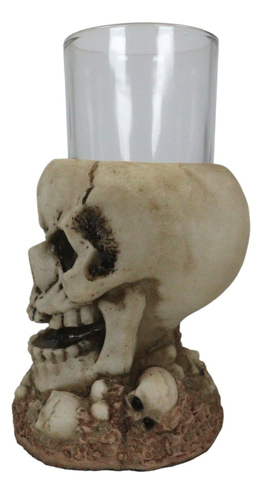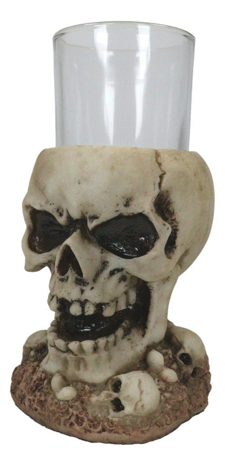 - Set Of 4 Grinning Giant Skull With Missing Tooth On Graveyard Shot Glass Shooter