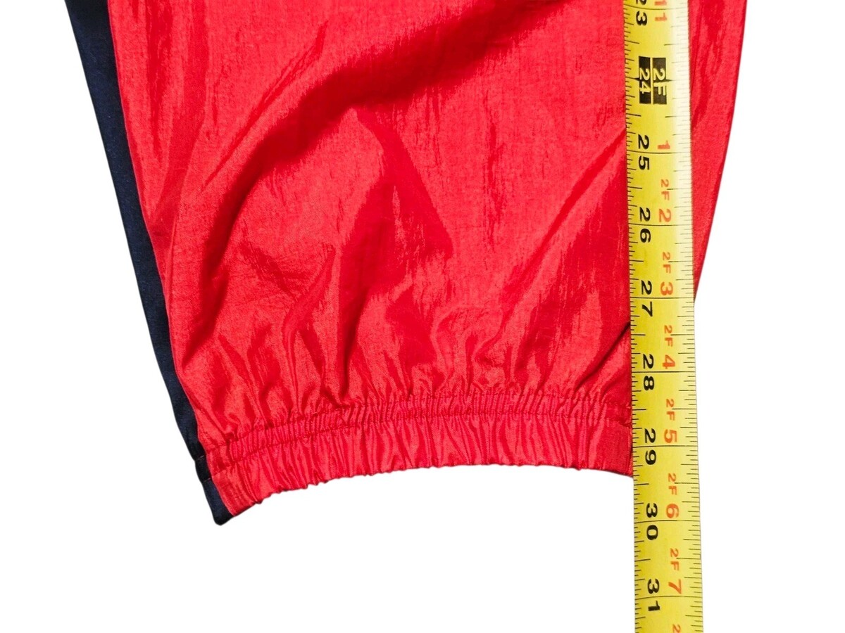 The Vintage River Edge RE Sport 80s Jacket is a stylish windbreaker made of durable nylon material, featuring a geometric red, white and blue pattern and colorful accents. This jacket has a relaxed fit, full zip closure, and convenient pockets, making it suitable for various occasions such as travel, parties, and casual wear during the summer, fall, and spring seasons. With its retro 80s theme, this nautical wind jacket in size L is a fashionable and practical addition to any wardrobe, perfect for both men and women looking for a timeless and lightweight outerwear option.