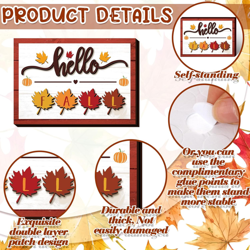 Fall Tiered Tray Decorations Set: you will receive 13 pieces of fall tiered tray decorations, including 7 pieces of freestanding fall decorations and 6 pieces of pumpkin and maple leaf shaped decorations that can be strung on the rope provided to form a banner, and there are some adhesive dots, sufficient quantity can meet your home or party tiered tray decor needs, and you can share with others