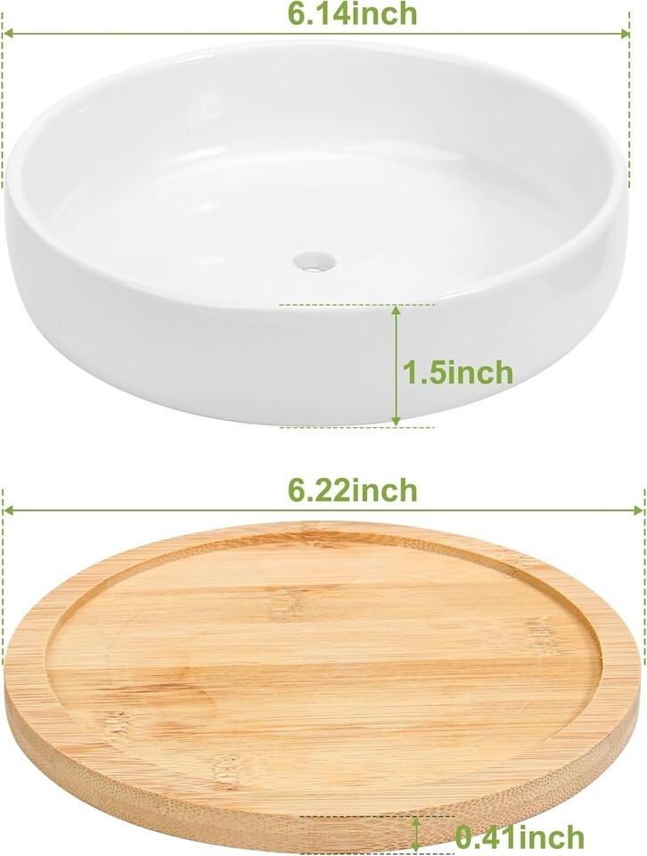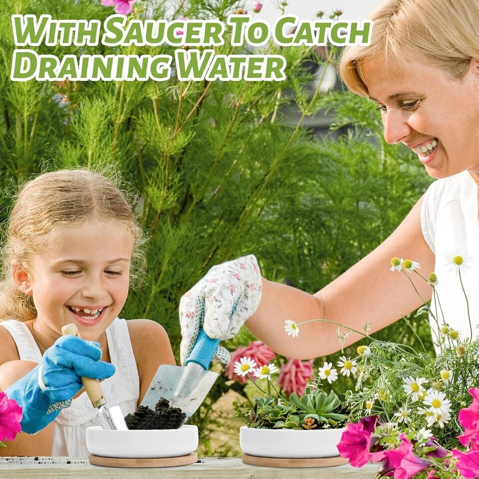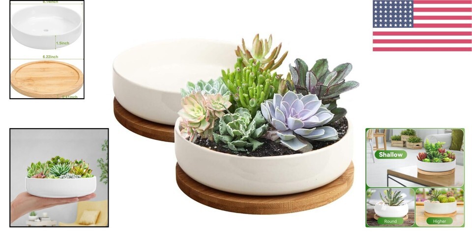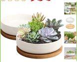 - Set of 2, 6-Inch White Ceramic Succulent Pots with Bamboo Tray for Indoor Use