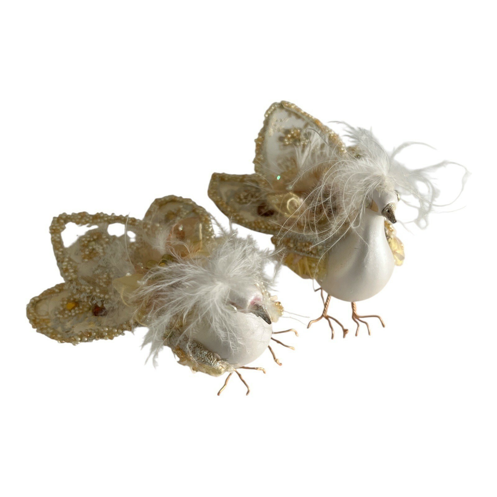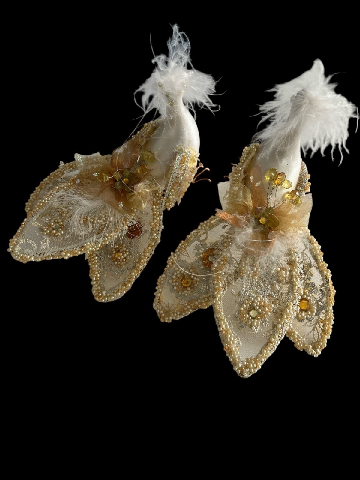 This pair of decorative birds features unusually ornate lace tails instead of feathers, giving them a distinctive and elegant look. The long lace tails are richly detailed with gold beading, sequins, and faux gems, making them shimmer beautifully when hung. Each bird has a pearlized white body, feather crest, beaded wings, and comes with filament threads for easy hanging. Perfect for weddings, Christmas trees, or unique vintage-inspired decor.