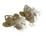 Set of 2 Decorative Birds with Beaded Lace Tails and Feather Crests ? Hanging Gold and White Ornaments ? 7"