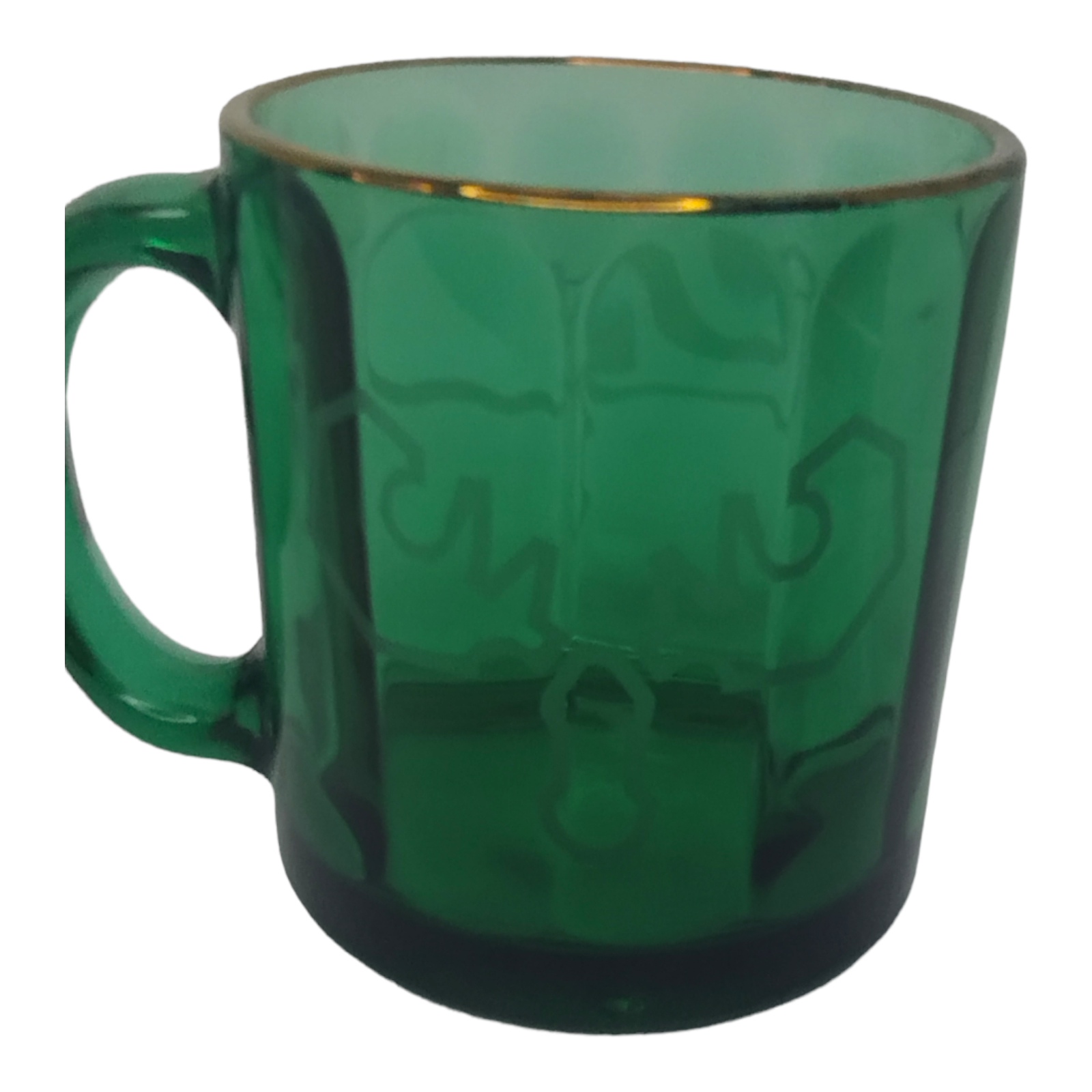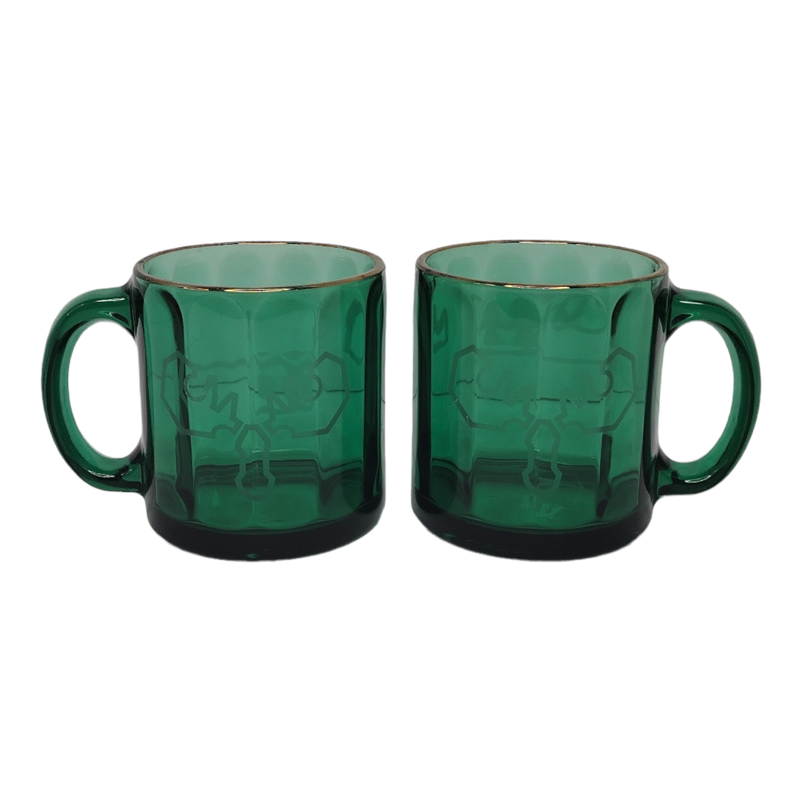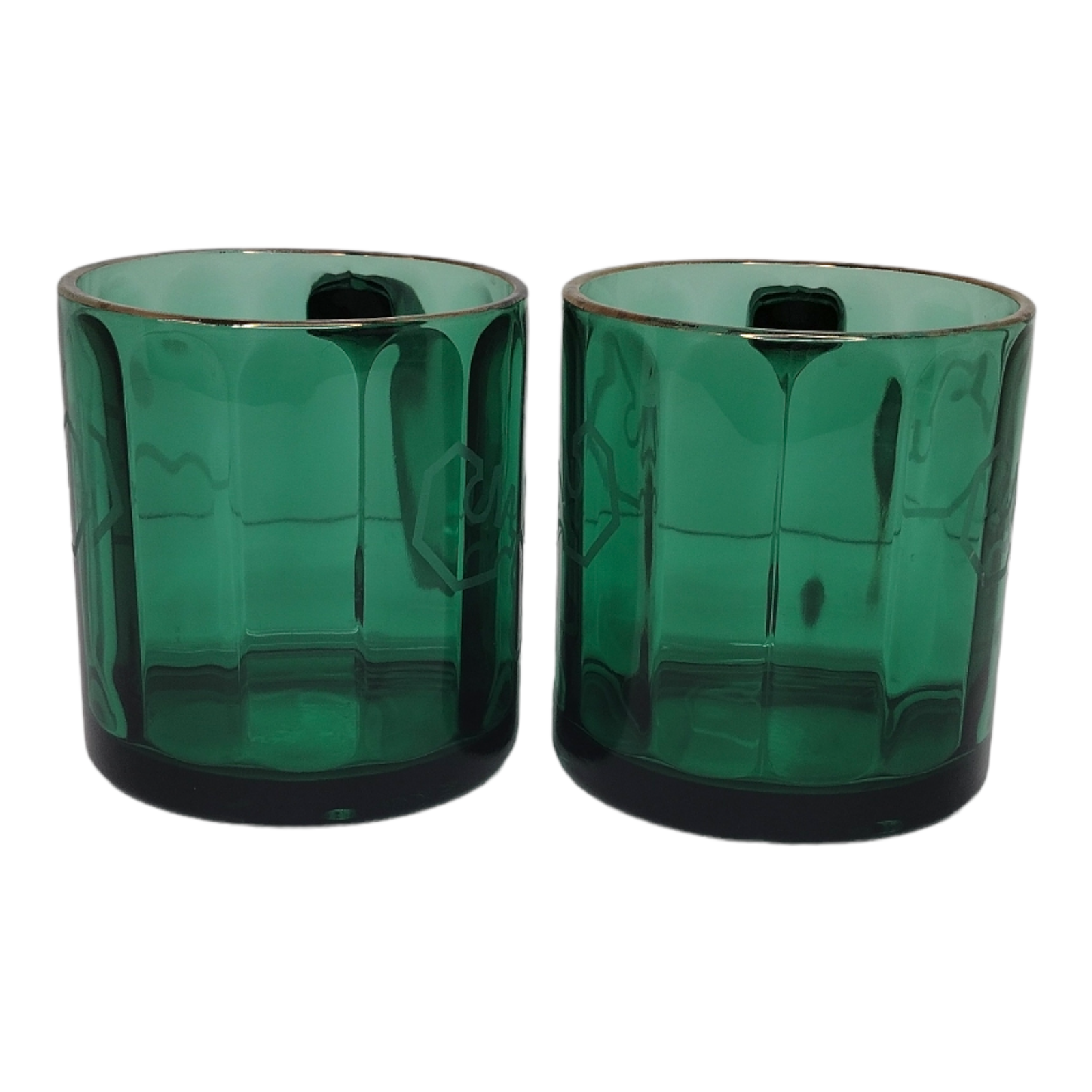 Set of 2 Green Glass Coffee Tea Mugs Cups with Etched Moose Head and Gold Colored Rims Mad in the USA. Pre-owned in Good Condition. No chips or cracks. Some light signs of wear, gold-colored rims have wear marks. Dark green color. Moose head etching is a neat design. 3.5" tall by 3" wide at opening. See all photos for details and condition. Will ship USPS Priority Mail.