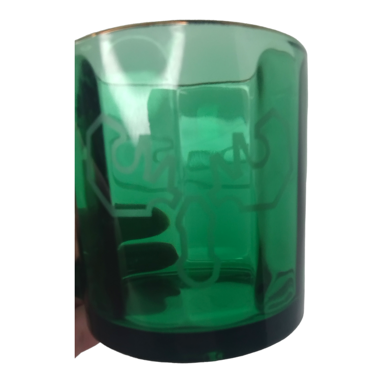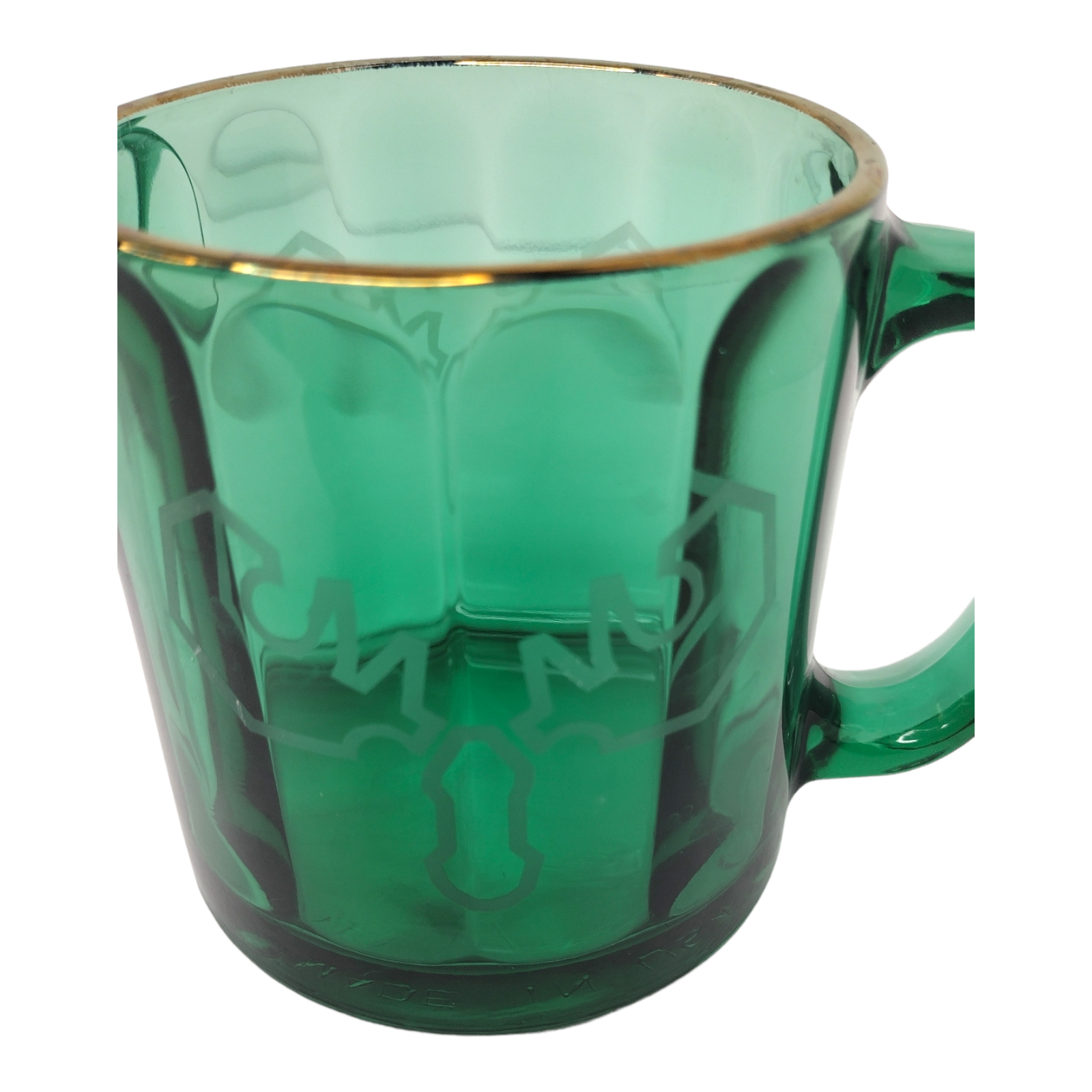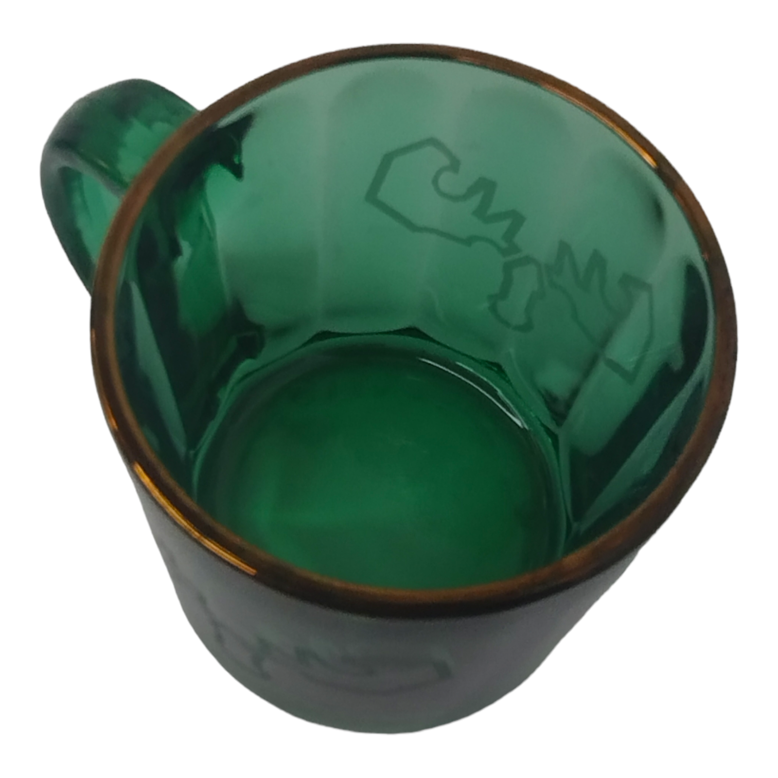 Set of 2 Green Glass Coffee Tea Mugs Cups with Etched Moose Head and Gold Colored Rims Mad in the USA. Pre-owned in Good Condition. No chips or cracks. Some light signs of wear, gold-colored rims have wear marks. Dark green color. Moose head etching is a neat design. 3.5" tall by 3" wide at opening. See all photos for details and condition. Will ship USPS Priority Mail.