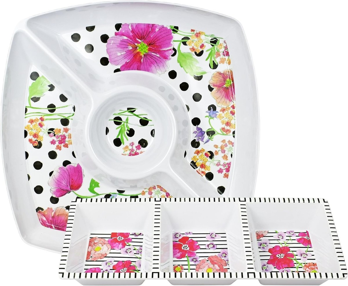 Set of 2 Home Basics Floral Design Serving Dish Set - 3-section Tray for Chips and Dip - 3-section Tray for Dip - a Party Necessity!
