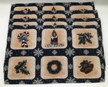Add festive charm to your holiday dining with this set of 4 woven Christmas placemats. Featuring classic holiday motifs including a wreath, holly, bells, candy cane, candle, and greenery, all framed with snowflakes on a dark background. Perfect for Christmas dinners, holiday parties, or everyday seasonal decor.