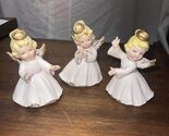 Set of 3 Vintage Lefton Porcelain Angels #1420 Gold Halo Tipped Wings 4" tall