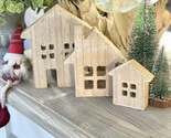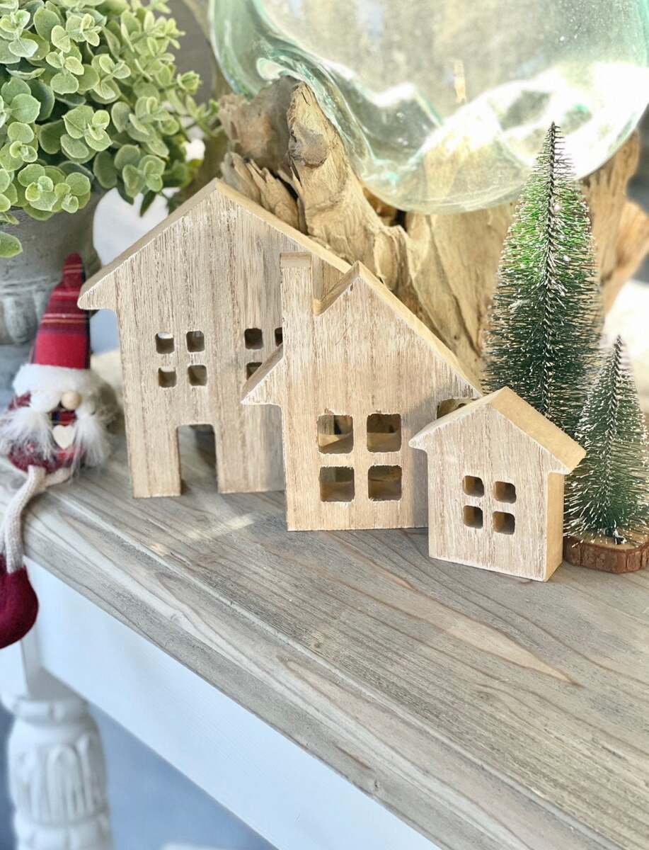 A gorgeous set of 3 wooden houses.Perfect Simple charm for creating that cosy decorative design. Wrapped and delivered in a satin bow. Ideal as a gift.