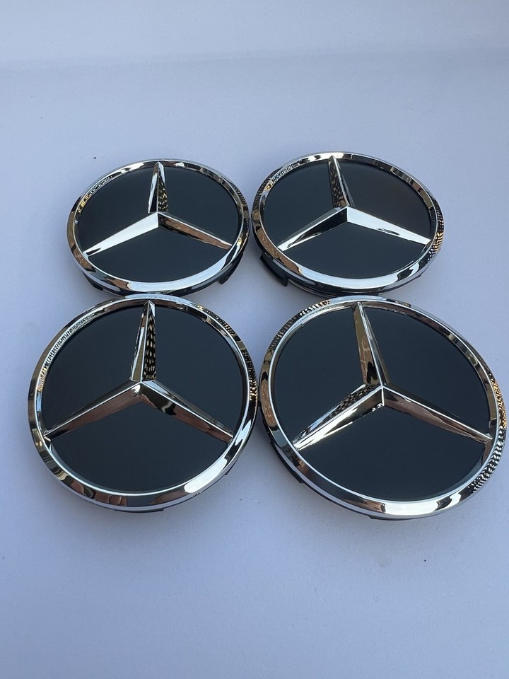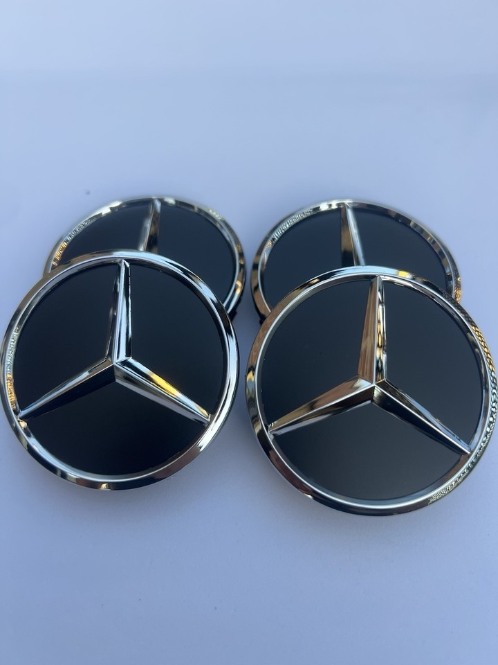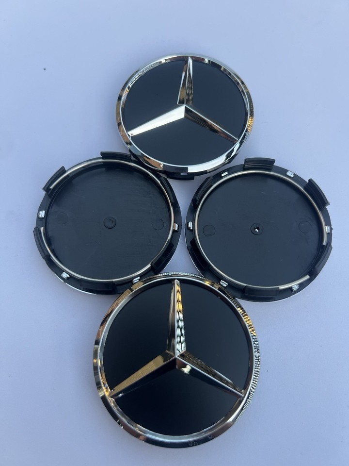 Elevate the look of your Mercedes with this set of 4 black matte wheel center caps. Each cap has an outside diameter of 60 mm and an inside diameter of 56 mm, ensuring a snug fit for your vehicle's wheels. These caps are designed with a sleek matte finish that complements any wheel style, maintaining a consistent and professional appearance for your car.